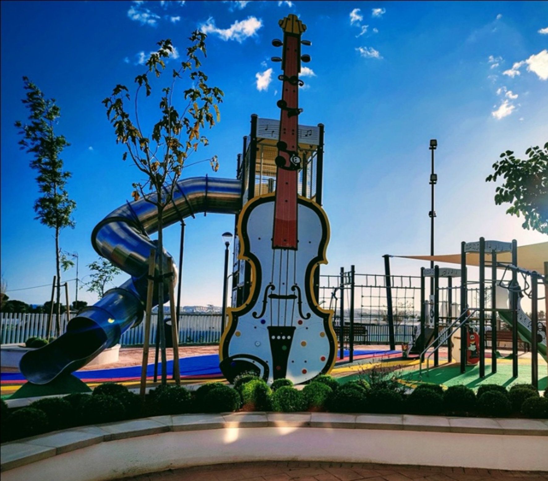 Se ha elegido la música como temática. El concejal de Ciudad Saludable, Antonio Expósito, explica que “la zona de juegos tendrá como elemento más llamativo un gran violín”. “Constará de varios elementos, entre ellos el gran violín con dos torres que contará con escalada vertical, un tobogán tubular, una escalera interior de caracol tematizada con notas musicales, además de una pequeña barra de bomberos y un pequeño mostrador a ras de suelo”, describe Expósito, que añade que la zona de juegos tendrá también una torre anexa que se comunicará por el tobogán, con tres accesos diferenciados y de diferentes dificultades: un túnel de gateo cómodo, la escalera de caracol y una torre por la que se asciende pasando de red en red. “Las torres están cerradas con mallas para garantizar la seguridad de las y los niños y contarán con un tejado que, además de sombra, proporcionará seguridad y dará vistosidad al juego”, añade Expósito, que precisa que “el suelo de seguridad para toda el área infantil será de caucho continuo con motivos musicales”.