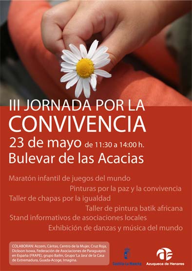El Bulevar de las Acacias acoge hoy la III Jornada por la Convivencia, que organiza el Ayuntamiento de Azuqueca de Henares. Juegos, talleres y expositores informativos se van a dar cita entre las 11,30 y las 14 horas, en el marco de las actividades programadas en esta jorndad. Según ha explicado la concejala de Servicios Sociales, María José Naranjo, "el objetivo de esta iniciativa es dar a conocer la realidad de otros países a través de sus manifestaciones culturales y artísticas".