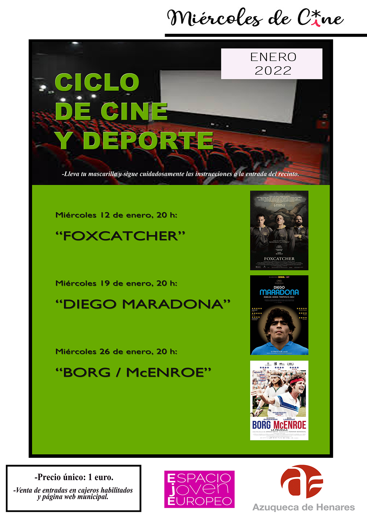 El Deporte es el tema elegido en enero para el Ciclo de Cine que programa cada mes el Ayuntamiento de Azuqueca de Henares en la sala de cine del Espacio Joven Europeo. Abre la programación el día 12 Foxcatcher, una cinta basada en la historia real del medallista olímpico Mark Schultz. El día 19, la cinta elegida es Diego Maradona, inspirada en el gran futbolista argentino. El ciclo finalizará el día 26 con Borg/McEnroe, que narra la historia de la rivalidad entre dos leyendas del tenis: el sueco Björn Borg y el norteamericano John McEnroe.