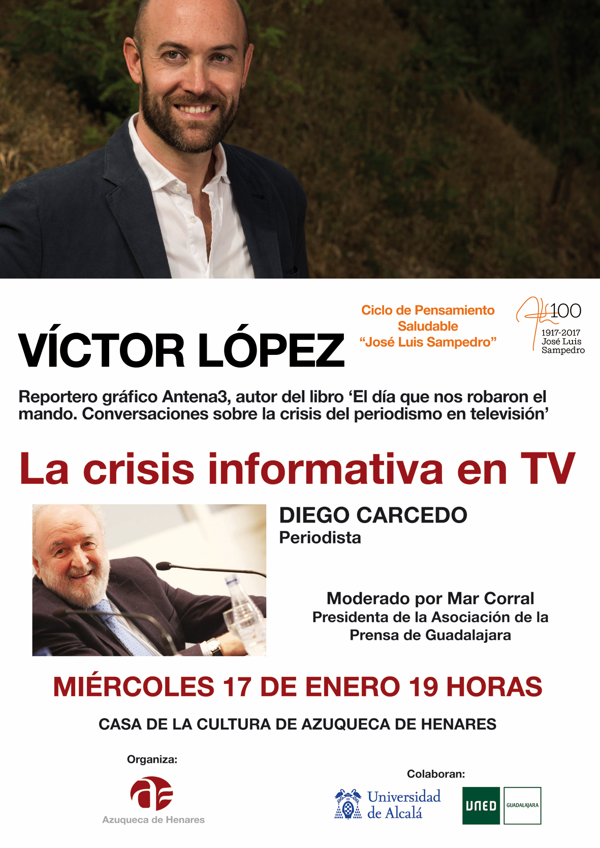 El Ayuntamiento de Azuqueca de Henares, con la colaboración de la Universidad de Alcalá y de la UNED, organiza el 17 de enero una nueva actividad en el marco del Ciclo de Pensamiento Saludable 'José Luis Sampedro'. Bajo el título 'La crisis informativa en TV', Víctor López, reportero gráfico de Antena 3 y autor del libro 'El día que nos robaron el mando. Conversaciones sobre la crisis del periodismo en televisión', y de Diego Carcedo, periodista, abordarán este tema con Mar Corral, presidenta de la Asociación de la Prensa de Guadalajara, como moderadora. La charla tendrá lugar en la Casa de la Cultura a partir de las 19 horas.El ciclo 'José Luis Sampedro' es una iniciativa que puso en marcha el Ayuntamiento azudense el año pasado, coincidiendo con el centenario del nacimiento de este humanista. "Es un homenaje muy pequeño para quien tanto aportó con su pensamiento, su literatura y su docencia", explicó el alcalde, José Luis Blanco, durante la presentación de este ciclo en abril de 2017. Las actividades comenzaron en mayo con la exposición 'Geografías literarias de José Luis Sampedro' y un coloquio entre Olga Lucas, traductora y compañera de Sampedro; el escritor y periodista Juan Cruz y el catedrático José Manuel Lucía, secretario de la Asociación de Amigos de José Luis Sampedro. Posteriormente, en junio, los periodistas Arsenio y Nacho Escolar, padre e hijo, analizaron la realidad española del último cuarto de siglo en España, mientras que en noviembre, el escritor y periodista Javier Reverte participó junto a Mariano López, director de la revista 'Viajar', en el encuentro titulado 'El arte de viajar', que moderó Raquel Gamo, periodista de eldiario.es/clm. La programación prosigue en 2018 con esta primera sesión sobre la televisión. "Queremos dar continuidad en el tiempo a este ciclo para poder fomentar una ciudadanía crítica, participativa, responsable y comprometida", apunta el alcalde, que considera a Sampedro un "pensador clave en la historia del país". Además del ciclo, Azuqueca cuenta con la avenida José Luis Sampedro, cuyo nombre también aparece en la rotonda de Los Escritores.