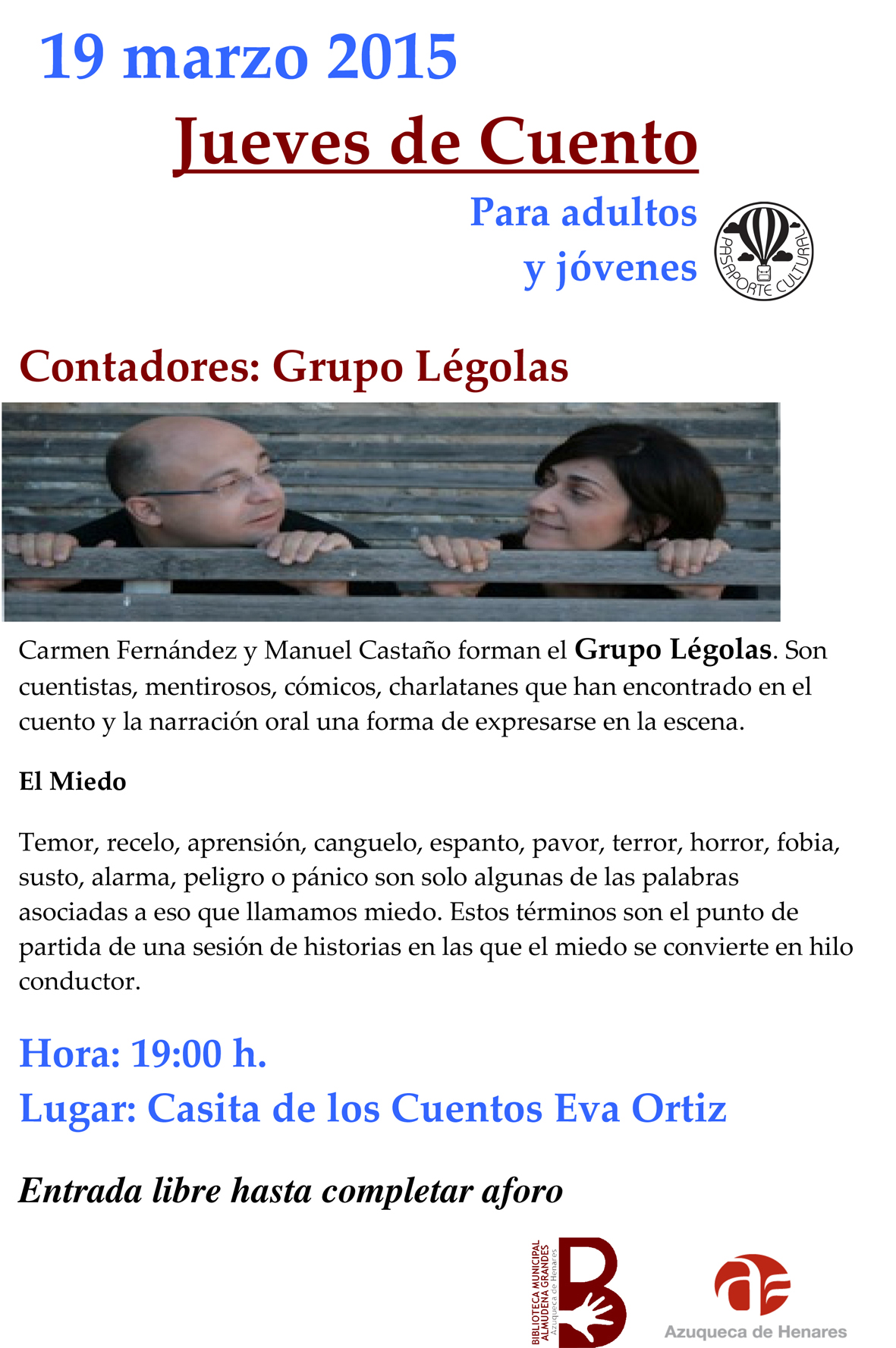 Este jueves, 19 de marzo, se celebra una nueva sesión del programa 'Jueves de Cuento', que promueve la Biblioteca Municipal Almudena Grandes en el marco de su programa de animación a la lectura. En esta ocasión, el Grupo Légolas, formado por Carmen Fernández y Manuel Castaño, estará desde las 19 horas en la Casita de los Cuentos Eva Ortiz con una selección de relatos que tienen el miedo como hilo conductor.La actividad está abierta al público en general y la entrada es libre hasta completar el aforo. 'Jueves de cuento' se incluye en el proyecto 'Pasaporte cultural' que ha puesto en marcha este curso el Ayuntamiento de Azuqueca de Henares en colaboración con los institutos de Secundaria de la localidad para acercar la cultura, la lectura y los libros al alumnado de tercer y cuarto curso de Secundaria y primero de Bachillerato.Estrella OrtizPor otra parte, el viernes 27 de marzo, Estrella Ortiz visita Azuqueca de Henares con 'Rotundifolia y sus cuentos a mano', una sesión en la que esta narradora profesional utiliza sus manos para acompañar diferentes historias. La actividad, que también alberga la Casita de los Cuentos, comienza a las 17:30 horas y la entrada es gratuita, previa retirada de las invitaciones en la sala infantil de la Biblioteca Infantil Almudena Grandes (disponibles desde este miércoles).Mujeres científicasPor último, desde este miércoles y hasta el próximo 30 de marzo, se puede visitar en la Casa de la Cultura la exposición 'Mujeres científicas', del Instituto de la Mujer de Castilla-La Mancha. Se trata de una muestra itinerante compuesta por 38 carteles con la que se pretende dar visibilidad a aquellas mujeres que han contribuido a lo largo de la historia al avance de la ciencia pero que, con frecuencia, no han sido reconocidas socialmente.
