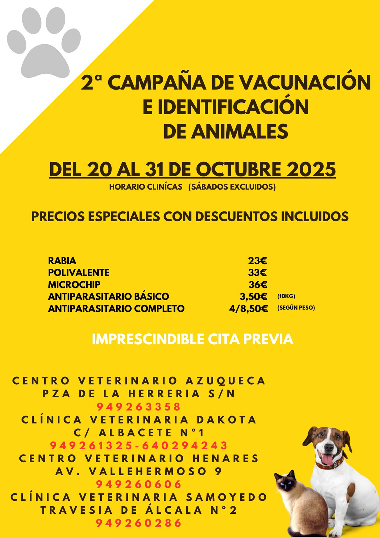 El Ayuntamiento de Azuqueca de Henares, con la colaboración de las clínicas veterinarias ubicadas en la localidad, pone en marcha desde el lunes, 20 de octubre, la segunda campaña de vacunación e identificación de animales de este año. Se desarrollará hasta el día 31 de octubre. "Con la organización de estas campañas -explica la concejala de Promoción de la Salud, Charo Martín-, se busca facilitar que las y los propietarios de mascotas cumplan con la normativa vigente y ofrecer el mejor cuidado y bienestar a los animales”. La edil recuerda que cada año se programan dos campañas de vacunación de este tipo. "La primera en 2025 fue en junio y ahora se convoca la segunda", precisa.