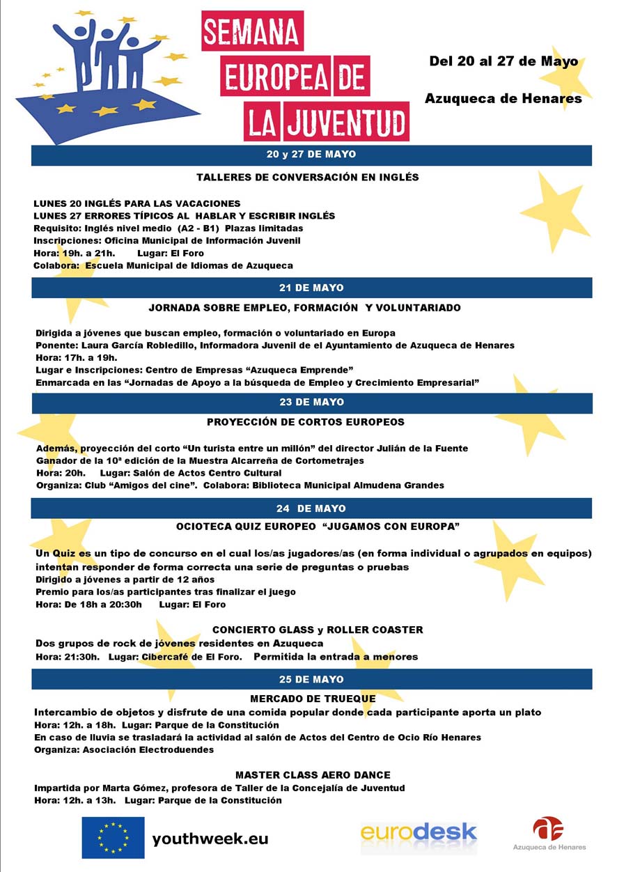 Los interesados en participar en alguno de los talleres de conversación en inglés organizados por el Ayuntamiento en colaboración con la Escuela Municipal de Idiomas de Azuqueca deben presentar su solicitud en la Oficina de Información Juvenil (OMIJ) ubicada en El Foro. El Ayuntamiento ha programado dos cursos, incluidos dentro de la programación de la Semana Europea de la Juventud, los lunes 20 y 27 de mayo, de 10 a 21 horas. La concejala de Juventud, Sagrario Bravo, explica que se admitirán solicitudes "hasta cubrir las cerca de 20 plazas habilitadas para cada curso". "La formación se dirige a jóvenes que ya posean ciertos conocimientos de inglés, en concreto entre los niveles A2 y B1 establecidos en el marco común europeo de referencia para las lenguas", añade la responsable municipal de Juventud. La sesión del día 20 se titula 'Inglés para las vacaciones', mientras que la segunda jornada se estudiarán los 'Errores típicos al hablar y escribir inglés'.Semana Europea de la JuventudLa Semana Europea de la Juventud dejará actividades en Azuqueca del 20 al 27 de mayo, "bajo el objetivo común de promover la ciudadanía activa entre los jóvenes y acercarles también a los programas europeos", en palabras de la concejala. El martes 21, el Centro de Empresas ha programado una jornada sobre empleo, formación y voluntariado que impartirá la informadora juvenil del Ayuntamiento abierta a jóvenes y enmarcada en el programa 'búsqueda de empleo y crecimiento empresarial'. Además, el jueves 23 se ha programado una muestra de cortos europeos, que incluye la proyección del corto ganador de la muestra alcarreña, 'Un turista entre un millón', dirigido por Julián de la Fuente. La muestra comenzará a las 20 horas en la Casa de la Cultura. Al día siguiente, dos nuevas actividades: el quizz 'Jugamos con Europa' y la actuación de los grupos Glass y Roller Coaster. Ambas prouestas se desarrollan en El Foro, a las 18 y a las 21:30 horas, respectivamente. Un mercado de trueque, el sábado 25 en el parque de La Constitución, cerrará las actividades de la Semana Europea. "Es una iniciativa en colaboración con la Asociación Electroduendes, que propone disfrutar además de una comida popular en el parque, a la que los asistentes deben aportar un plato", adelanta la edil, quien advierte de que en caso de que llueva "la actividad se trasladará al centro de ocio". El mercadillo comenzará a las 12 horas, y durante la primera hora la profesora del talller municipal de juventud de aerodance impartirá una calse abierta. Más información sobre las actividades de la Semana Europea AQUI