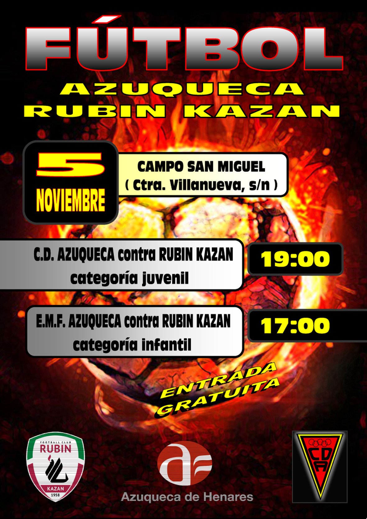 La cantera del club ruso Rubin Kazan, uno de los más importantes del país, visita el lunes 5 de noviembre Azuqueca de Henares para medirse con dos equipos de la localidad. “Un problema en el vuelo, obligó a cancelar esta jornada, prevista inicialmente para el 30 de octubre, pero, finalmente, gracias a las gestiones realizadas desde el Ayuntamiento, así como a la buena disposición del Rubin Kazan, se ha podido fijar una nueva fecha”, explica el concejal de Deportes, José Luis Escudero.El edil recuerda que los partidos se juegan en el campo municipal del San Miguel, donde el club ruso se enfrenta a las 17 horas al conjunto infantil regional de la Escuela Municipal de Fútbol de Azuqueca, mientras que a las 19 horas se mide con un juvenil del Club Deportivo Azuqueca. Además, al acabar los partidos, el club ruso va a atender en la sala de prensa del San Miguel a los medios que se desplacen al campo para dar cobertura a esta cita deportiva.El responsable municipal de Deportes agradece la colaboración del Rubin Kazan, que, en el marco de unas jornadas formativas y de convivencia que ha organizado en España, ha incluido una parada en Azuqueca de Henares. “Esta visita no supone ningún coste para el Ayuntamiento, que se limita a ceder las instalaciones que van a albergar los partidos”, matiza, al tiempo que recuerda que los rusos también se van a medir a la cantera del Real Madrid y del Atlético de Madrid.Entrada gratuitaJosé Luis Escudero insiste en que la entrada es gratuita. “Queremos que los aficionados al fútbol, tanto niños, como jóvenes y adultos, tengan la oportunidad de disfrutar de un juego de calidad e intenso, al tiempo que apoyan a los equipos azudenses”, señala el edil.