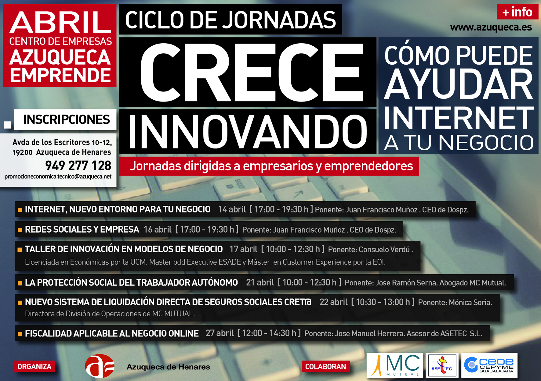 Con la sesión 'Internet, nuevo entorno para tu negocio', el martes 14 de abril, comienza el nuevo ciclo de jornadas formativas organizado por el Ayuntamiento de Azuqueca y dirigido a empresarios y emprendedores. Bajo el nombre 'Crece innovando. Cómo puede ayudar internet a tu negocio', se han programado seis charlas gratuitas que abarcan distintas facetas empresariales y que se van a desarrollar a lo largo de abril en las instalaciones del Centro de Empresas (Avenida de los Escritores, 10-12). Colaboran con el Ayuntamiento en la organización de este ciclo desde Asetec, MC Mutual y CEOE Cepyme. La inscripción se puede cursar de manera presencial en el Centro de Empresas, o bien, a través del teléfono 949 27 71 28 o el correo electrónico