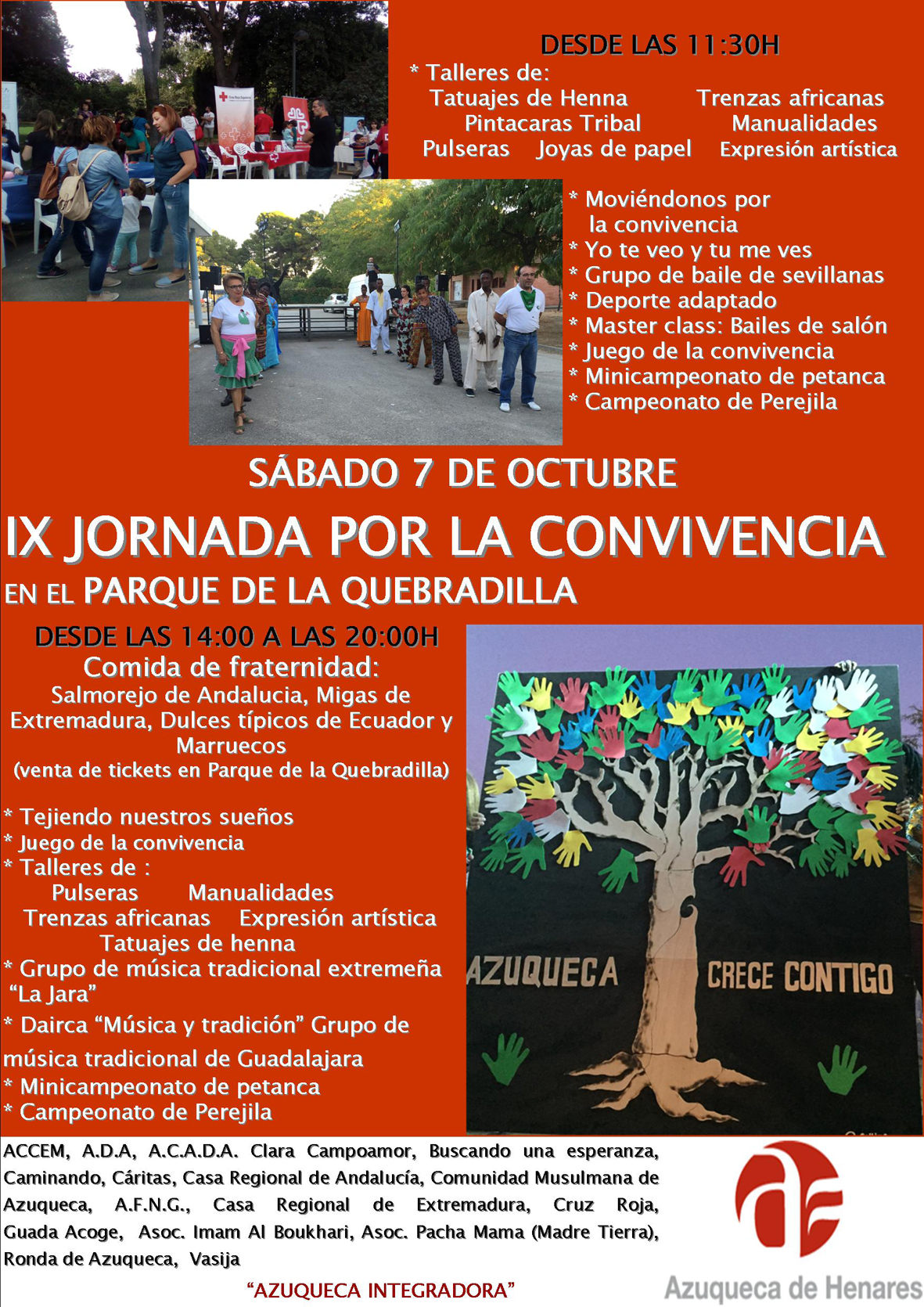 El Ayuntamiento de Azuqueca, en colaboración con distintos colectivos de la ciudad, celebra este sábado, 7 de octubre, una nueva Jornada por la Convivencia. "Esta iniciativa, que se enmarca en el programa municipal 'Azuqueca integradora', se puso en marcha hace ya nueve años con el objetivo de crear un punto de encuentro para fomentar el conocimiento, el respeto y la hermandad entre los vecinos y vecinas de Azuqueca, sin importar su lugar de procedencia, su religión o cualquier otra condición", explica la concejala de Cohesión Social, Elisa Cansado, quien aclara que "desde el año pasado, se ha ampliado a todo el día y se ha incluido la comida, un momento que favorece el diálogo, el intercambio y, en definitiva, la integración".La edil destaca "la buena acogida que tiene esta Jornada, que no ha parado de crecer, tanto en público, como en participación". En este sentido, una quincena de colectivos azudenses se han sumado a esta edición: ACCEM, ADA, ACADA Clara Campoamor, Buscando una esperanza, Caminando, Cáritas, Casa Regional de Andalucía, Comunidad Musulmana de Azuqueca, AFNG, Casa Regional de Extremadura, Cruz Roja, Guada Acoge, Asociación Iman Al Boukhari, Asociación Pacha Mama (Madre Tierra), la Ronda de Azuqueca y Vasija. Elisa Cansado les agradece su "disposición y propuestas" y destaca que "con su trabajo e ilusión, se han programado un gran número de actividades durante todo el día". La concejala azudense lanza una invitación "a los vecinos y vecinas, a las familias, para que se animen a disfrutar de esta jornada".Programa de actividadesEl parque de La Quebradilla acoge la IX Jornada por la Convivencia, que comienza a las 11:30 horas. Por la mañana, se han organizado talleres de tatuajes de henna, trenzas africanas, pintacaras tribal, manualidades, pulseras, joyas de papel y expresión artística. Moviéndonos por la convivencia, Yo te veo y tú me ves, grupo de baile de sevillanas, deporte adaptado, una clase magistral de bailes de salón, el Juego de la convivencia, minicampeonato de petanca y campeonato de perejila completan las propuestas de la mañana.A las 14 horas, se ofrece una comida de fraternidad con salmorejo de Andalucía, migas de Extremadura y dulces típicos de Ecuador y Marruecos. Los vales se pondrán adquirir en el propio parque de La Quebradilla al precio de un euro por plato/ración. Por la tarde, hasta las 20 horas, se continúan los talleres de pulseras, manualidades, trenzas africanas, expresión artística y tatuajes de henna, a los que se suman las actividades Tejiendo nuestros sueños, el Juego de la convivencia, petanca, rana, perejila y las actuaciones de La Jara (música tradicional extremeña) y Dairca (música tradicional de Guadalajara).