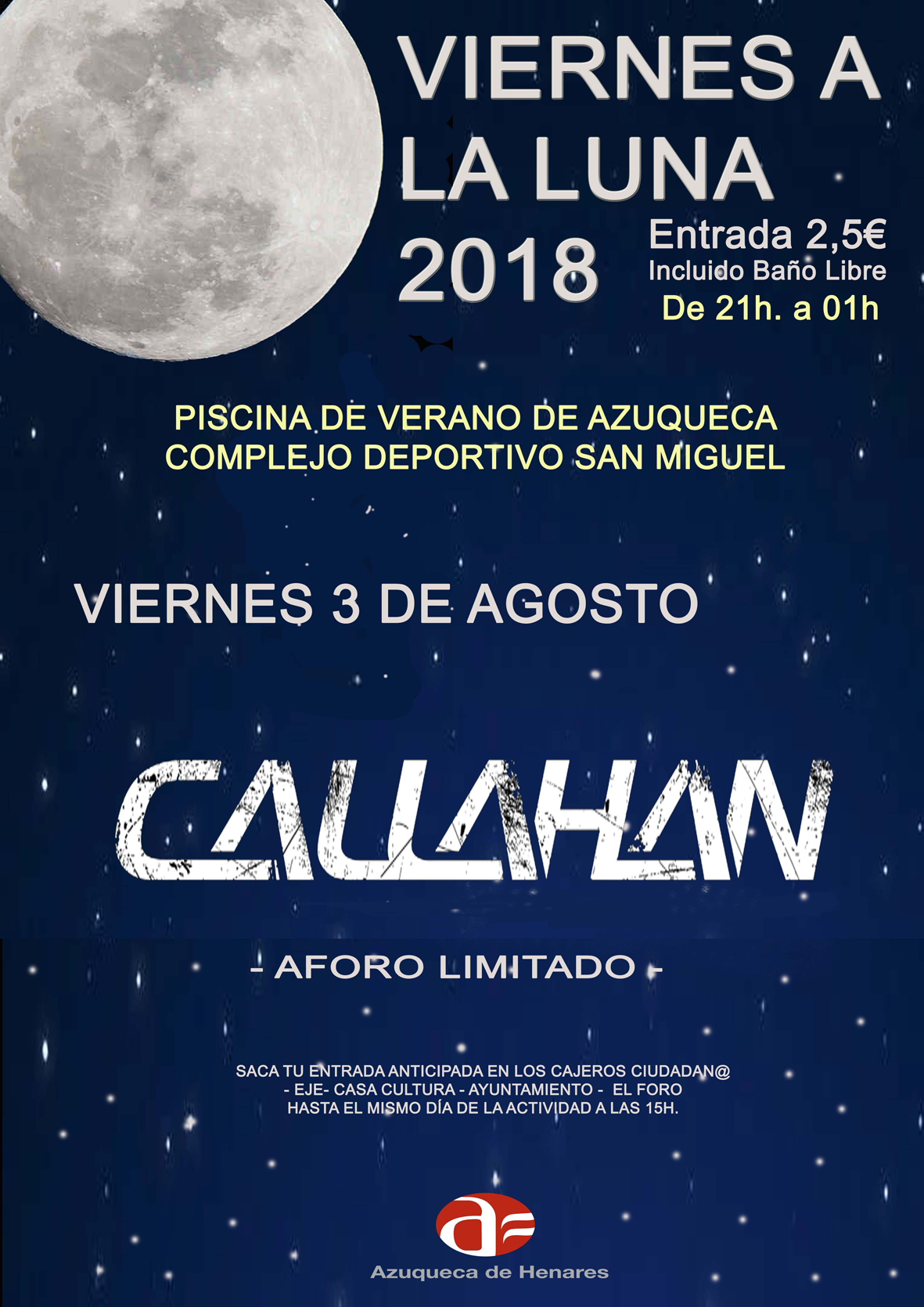 El grupo azudense 'Callahan' ofrece el 3 de agosto un concierto en la última sesión del programa 'Viernes a la luna', que impulsa el Ayuntamiento de Azuqueca de Henares. La piscina de verano, ubicada en el complejo San Miguel, acoge esta cita musical a partir de las 21 horas y hasta la una de la madrugada. El aforo es limitado y las entradas cuestan de 2,50 euros, con baño libre incluido. Se pueden adquirir de manera anticipada y en los cajeros ciudadanos ubicados en la Casa de la Cultura, El Foro, el EJE y el Ayuntamiento (venta habilitada hasta las 15 horas del viernes 3). El mismo día, también están disponibles en la taquilla de la piscina.Actividades en el EJEPor otra parte, el Espacio Joven Europeo (EJE) acoge dos propuestas: cine y 'Titiriqueca'. Dentro de la programación 'Un verano para recordar... Cine de aventuras', este viernes, a las 20:30 horas, se proyecta la película para todos los públicos 'Cazafantasmas' (2016). El precio es de 2 euros.En la cartelera comercial, este fin de semana se puede ver también 'Cazafantasmas' (2016), el sábado 4 y el domingo 5, a las 18 horas, y 'Ocean's 8' (no recomendada para menores de 16 años), el viernes 3, a las 18 horas, y el sábado 4 y el domingo 5, a las 21 horas. En este caso las entradas cuestan, para los titulares de la Tarjeta Ciudadana, 3 euros (adultos) y 2 euros (infantil) y, en el caso de carecer de este documento municipal, 3,80 y 2,45 euros, respectivamente.Las localidades para el cine están a la venta de manera anticipada en los cajeros ciudadanos, ubicados en la Casa de la Cultura, El Foro, el EJE y el Ayuntamiento, así como en la web municipal (pinche AQUÍ), o bien, el mismo día, en taquilla, hora y media antes del inicio de la sesión.En cuanto a 'Titiriqueca', el sábado 4, a las 20:30 horas, la compañía madrileña ChikiSound presenta en la plaza del EJE 'ChiquiSound', un espectáculo musical de rock dirigido a un público infantil y familiar. La actividad es gratuita.