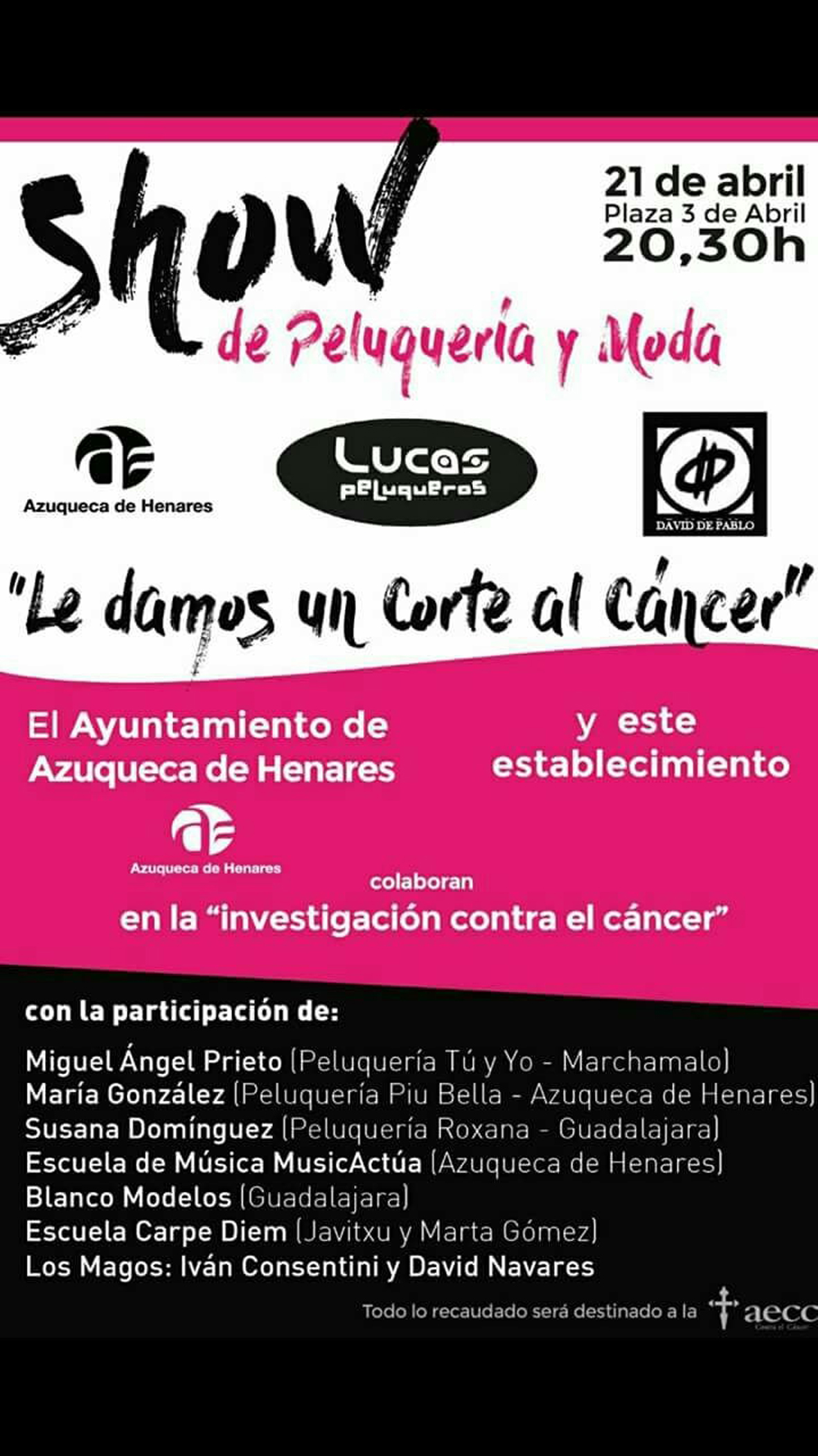 El establecimiento de Azuqueca Lucas Peluqueros con la colaboración del Ayuntamiento organiza este sábado, 21 de abril, un Show de Peluquería y Moda, que comenzará a las 20:30 horas en la plaza 3 de Abril. Bajo el lema 'Le damos un corte al cáncer', la actividad, en la que colaboran alrededor de 150 voluntarios y voluntarias, tiene caracter solidario y el dinero será entregado a la Asociación Española Contra el Cáncer (AECC) para colaborar en la investigación de esta enfermedad. Hasta el momento, se han recaudado cerca de 11.000 euros gracias a la colaboración de comercios y empresas.De manera previa, desde las 16 horas, se han programado actividades de animación dirigidas a todos los públicos. En concreto, la jornada comenzará a las 16 horas con música rap y batallas de gallos, a la que seguirá a partir de las 17 horas, una actuación de la charanga azudense. A las 18 horas, Iván Consentini y David Navares ofrecerán un espectáculo de magia y a las 19 horas, el grupo Soulfit interpretará temas de soul, gospel, reggae y funk.El Show de Peluquería y Moda, que presentará el periodista Juan Solo desde las 20:30 horas, cuenta con la participación de profesionales de la peluquería de Azuqueca, Marchamalo y Guadalajara, así como de la escuela de música MusicActúa, Blanco Modelos y la escuela Carpe Diem y de Aitana, concursante de la tercera edición del programa de televisión 'La Voz'.
