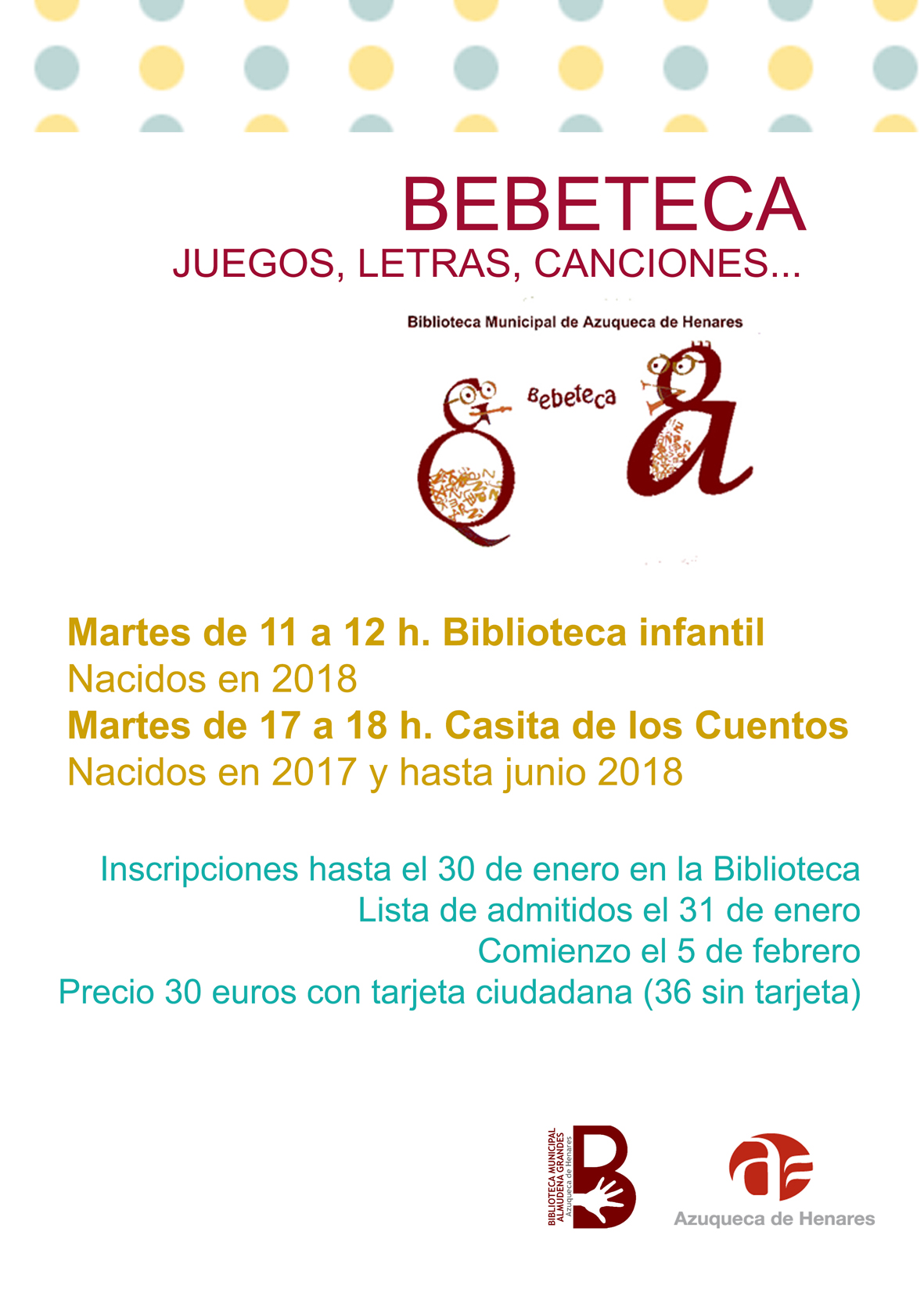 Hasta el 30 de enero, se mantiene abierto el plazo de preinscripción en el taller 'Juegos, letras, canciones...' de la Bebeteca. "Se trata de una actividad de animación a la lectura que impulsa la Biblioteca Municipal Almudena Grandes para que los niños y niñas de 0 a 3 años, acompañados de un adulto, puedan acercarse de los libros de una manera lúdica, al tiempo que se plantean a los padres y madres propuestas para casa", explica la concejala de Cultura, Sagrario Bravo.Las sesiones, que imparte Luisa Borreguero, se centran en el juego, la narración oral, las canciones populares y la poesía. Se ofertan dos grupos: los martes, de 11 a 12 horas, en la sala infantil de la Biblioteca, para nacidos en 2018, y, como novedad, en horario de tarde, los martes, de 17 a 18 horas, en la Casita de los Cuentos Eva Ortiz, para nacidos en 2017 y hasta junio de 2018.El precio del taller, para titulares de la Tarjeta Ciudadana, es de 30 euros y, sin este documento municipal, de 36 euros. En el caso de hermanos, se aplica un descuento de 10 euros. Los bebés deben ser socios de la Biblioteca y se da prioridad a los empadronados en Azuqueca. Las faltas de asistencia sin justificar (más de tres) son motivo de baja en el taller.Las listas de admisión se publicarán el 31 de enero, cuando, si es necesario, se realizará el sorteo de plazas. Las inscripciones se podrán formalizar del 1 al 4 de febrero. Los talleres comenzarán el 5 de febrero.