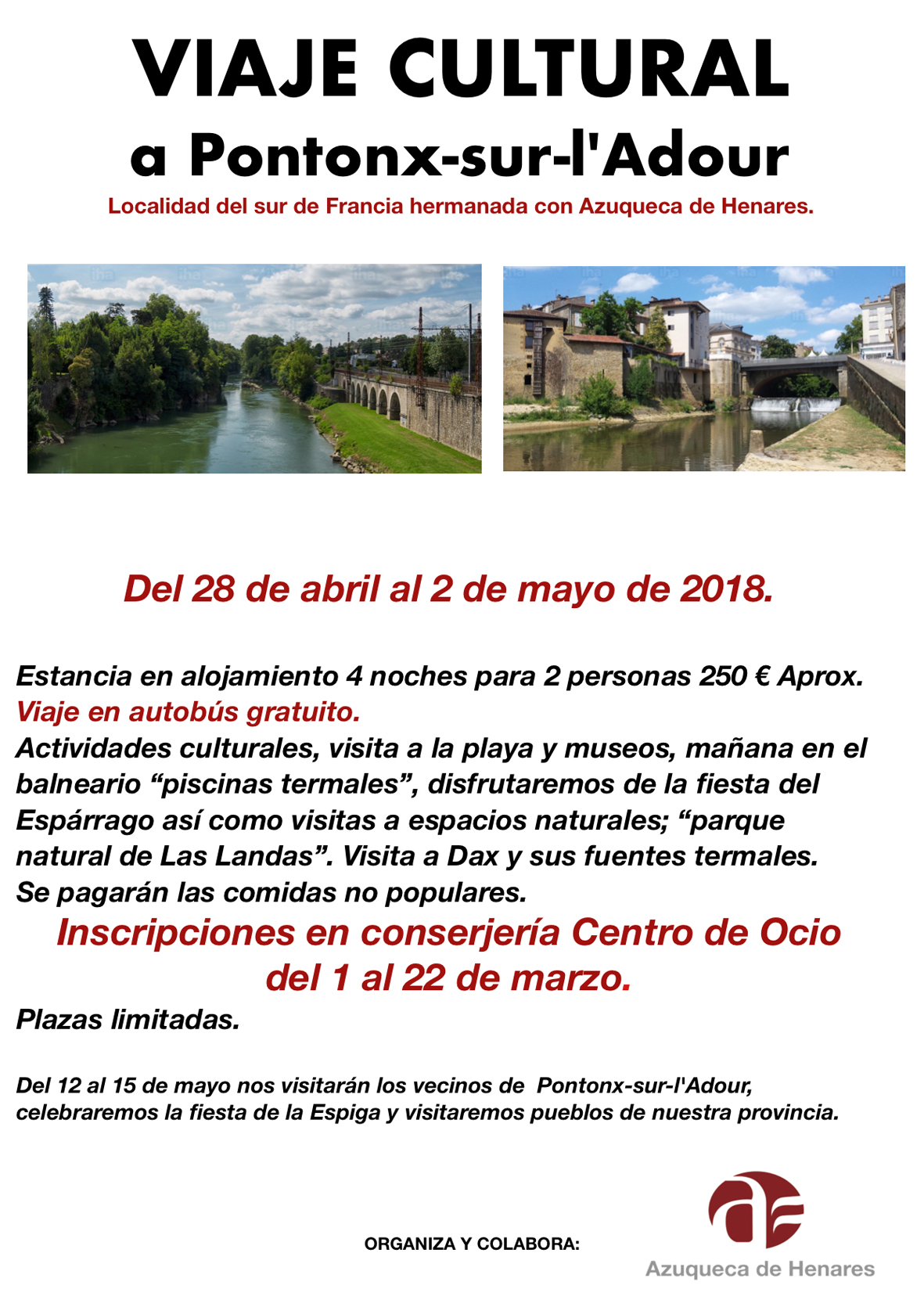 Por otra parte, hasta el 22 de marzo, se mantiene abierta la inscripción en el viaje a Pontonx-sur-l'Adour, ciudad de Francia con la que se hermanó Azuqueca de Henares en julio del año pasado. La actividad se va a desarrollar entre el 28 de abril y el 2 de mayo e incluye actividades culturales, visita a la playa, museos, balneario espacios naturales y participación en la Fiesta del Espárrago, entre otras propuestas. El precio es de 250 euros, aproximadamente, para dos personas e incluye traslado en autobús, estancia en alojamiento de 4 noches y comidas populares (se pagarán el resto de comidas). Las plazas son limitadas.El Ayuntamiento también organiza el jueves 5 de abril una salida a Madrid para ver la obra de teatro 'La madre que me parió' (20:30 h., teatro Fígaro, salida del autobús a las 18:30 h.). El 12 de marzo, de 11 a 13 horas, se abre la inscripción y el precio es de 26 euros e incluye traslado en autobús, entrada al teatro y cena. Si el número de solicitudes supera al de plazas disponibles, el mismo día 12 se celebrará un sorteo, mientras que el pago y sorteo de asientos en el autobús se hará el día 13, a las 12 horas.