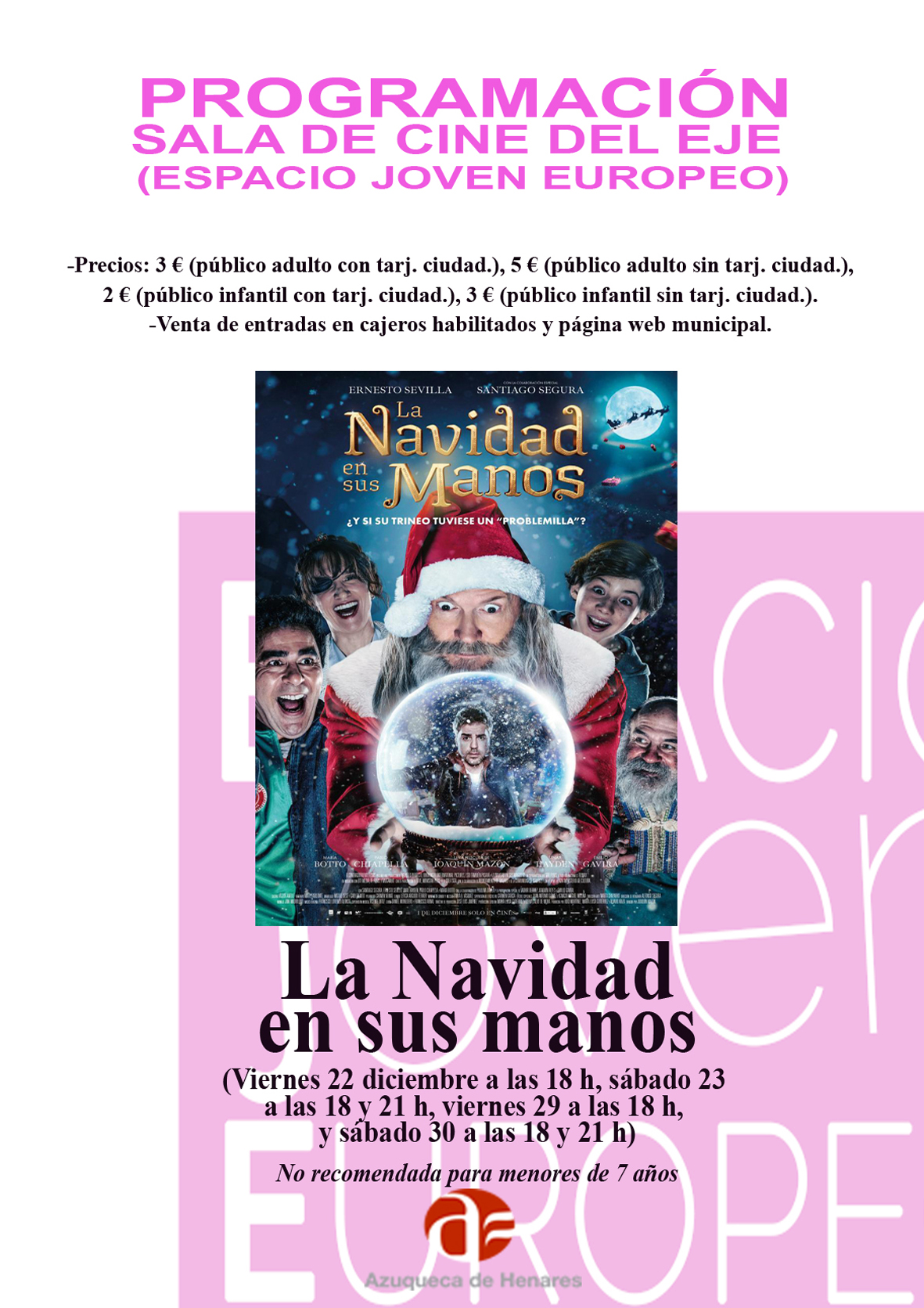 La película “La Navidad en sus manos”, que protagonizan Ernesto Sevilla y Santiago, se va a proyectar en la sala de cine del Espacio Joven Europeo (EJE) de Azuqueca de Henares. En concreto, se podrá ver los viernes día 22 y 29 de diciembre, a las 18 horas, y los sábados 23 y 30 de diciembre, en doble sesión: a las 18 y a las 21 horas.