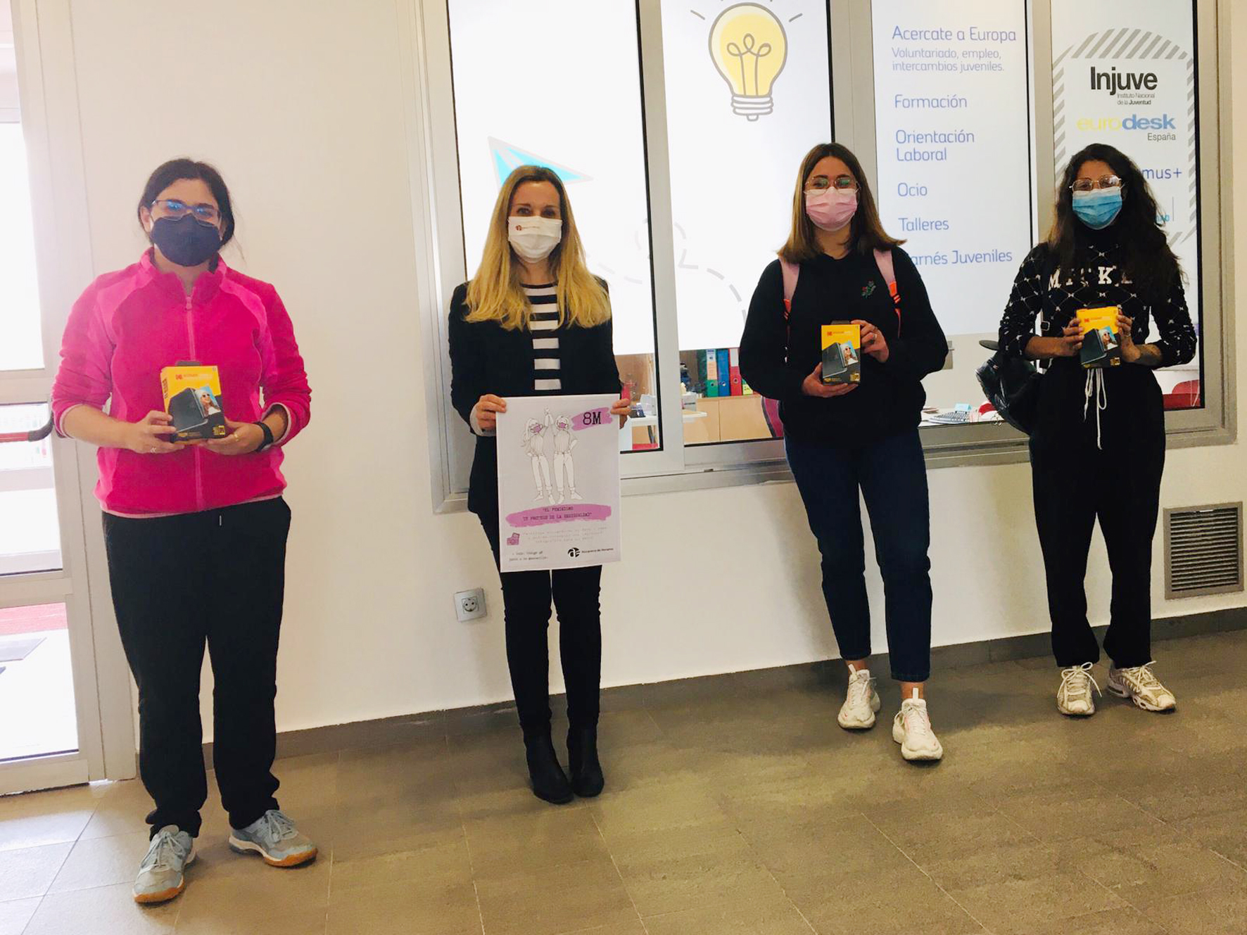 La concejala de Igualdad de Oportunidades, Piedad Agudo, ha entregado en la OMIJE (Oficina Municipal de Información Juvenil Europea) los premios del concurso fotográfico convocado por el Ayuntamiento de Azuqueca de Henares dentro de las actividades del 8 de Marzo, Día Internacional de las Mujeres. "Bajo el lema 'El feminismo te protege de la desigualdad', lanzamos una campaña que consistió en la distribución de mascarillas de color violeta entre el alumnado de los institutos de Azuqueca y, como complemento, se animaba a los y las estudiantes a sacarse fotografías con la mascarilla recibida y acompañar esa imagen con una frase que, desde su perspectiva u opinión, reivindicara la igualdad", explica la edil.El Centro de la Mujer y la Oficinal Municipal de Información Juvenil Europea (OMIJE) seleccionaron diez fotos y se publicaron en los perfiles de Juventud en las Redes Sociales Instagram (@juventudazuqueca) y Facebook (Juventud Azuqueca). Las tres fotos con más votos han sido premiadas con una impresora para móvil. En concreto, las alumnas reconocidas son Arantxa Aguilar, Carlota Pescador y Nerea Rosa Talaya, que participaron con estas frases, respectivamente: "No quiero que vuelvas, lo que quiero es que no te vayas. Si brillas, que se por tu esencia, no por tu ausencia", "El feminismo es la delgada línea que separa la ignorancia de la igualdad" y "Alcanzaremos la igualdad cuando no hablemos de hombres o mujeres, sino solo de personas".Piedad Agudo agradeció la participación y felicitó a las ganadoras. "El objetivo de este concurso era animar a la población juvenil a reflexionar sobre la igualdad, su significado y sus formas", señala la concejala. "Es importante fomentar y concienciar desde edades tempranas y, especialmente, en la adolescencia y juventud para evitar que aprendan o repitan comportamientos o actitudes basadas en estereotipos sobre las diferencias entre mujeres y hombres", concluye.