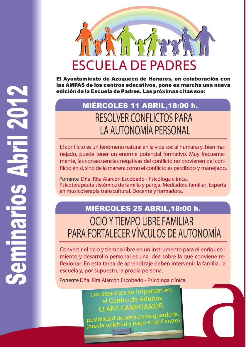 'Resolver conflictos para la autonomía personal' es el título de la sesión de Escuela de Padres programada para el miércoles 11 de abril, de 18 a 20 horas, en el Centro de Adultos Clara Campoamor. La concejala de Educación, Elisa Cansado, recuerda que Escuela de Padres es "una actividad gratuita, abierta no sólo a padres y madres, sino también a abuelos, profesionales de la educación e, incluso, a los propios jóvenes”. Para facilitar la asistencia, se ofrece un servicio de guardería en el mismo centro, previa solicitud y pago.La ponente de la sesión del día 11 es la psicóloga Rita Alarcón, que se hará cargo también de la siguiente jornada de Escuela de Padres: 'Ocio y tiempo libre familiar para fortalecer vínculos y autonomía', programada para el día 25 de abril, en el mismo lugar y a la misma hora.Para participar en las sesiones no es necesario formalizar inscripción previa.