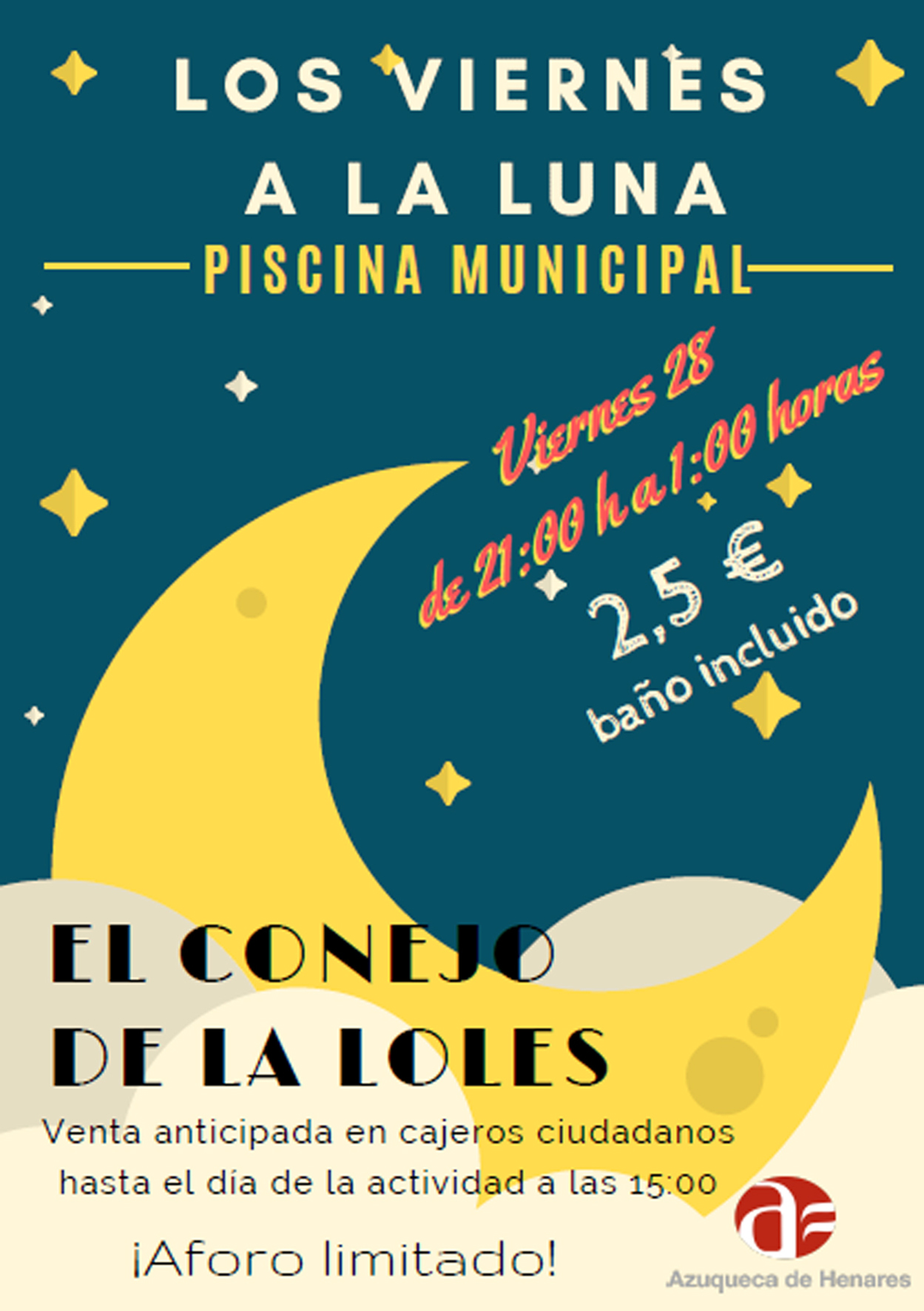 El programa de ocio veraniego 'Viernes a la Luna' comienza con una sesión nocturna a cargo de la charanga 'El conejo de la Loles', este viernes, día 28 de junio, en las instalaciones de la piscina municipal de verano de Azuqueca de Henares, de 21 a 1 horas. Las entradas ya están a la venta en los cajeros ciudadanos, donde se podrán adquirir al precio de 2,5 euros hasta las 15 horas del viernes; a partir de ese momento, la venta se centralizará en la taquilla de la piscina. Este programa impulsado por el Ayuntamiento de Azuqueca de Henares ofrece el acceso a la piscina y distintas actuaciones en horario nocturno. El concejal de Retos Deportivos, Enrique Pérez de la Cruz, ha explicado que "se mantiene una alternativa de ocio saludable dirigida a las familias, que amplía la oferta en la ciudad en las noches más calurosas del año, como va a ser esta primera, en plena ola de calor, según las previsiones meteorológicas". También este año se han programado cuatro sesiones de 'Viernes a la luna' a lo largo del verano. Tras esta primera, en julio se desarrollarán los días 12 y 26 y en agosto, el día 9.