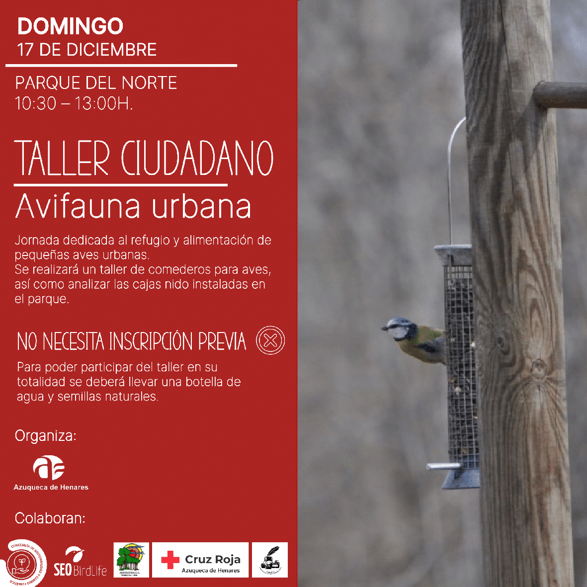 El parque del Norte acoge este domingo, 17 de diciembre, entre las 10:30 y las 13 horas, un taller ciudadano de avifauna urbana organizado por el Ayuntamiento de Azuqueca de Henares. “Es una actividad gratuita dirigida a la población en general, en especial, infantil, familiar y juvenil”, explica el concejal de Sostenibilidad, Rodrigo Vasco, quien aclara que “no es necesario inscribirse previamente, basta con acudir directamente al parque”.
