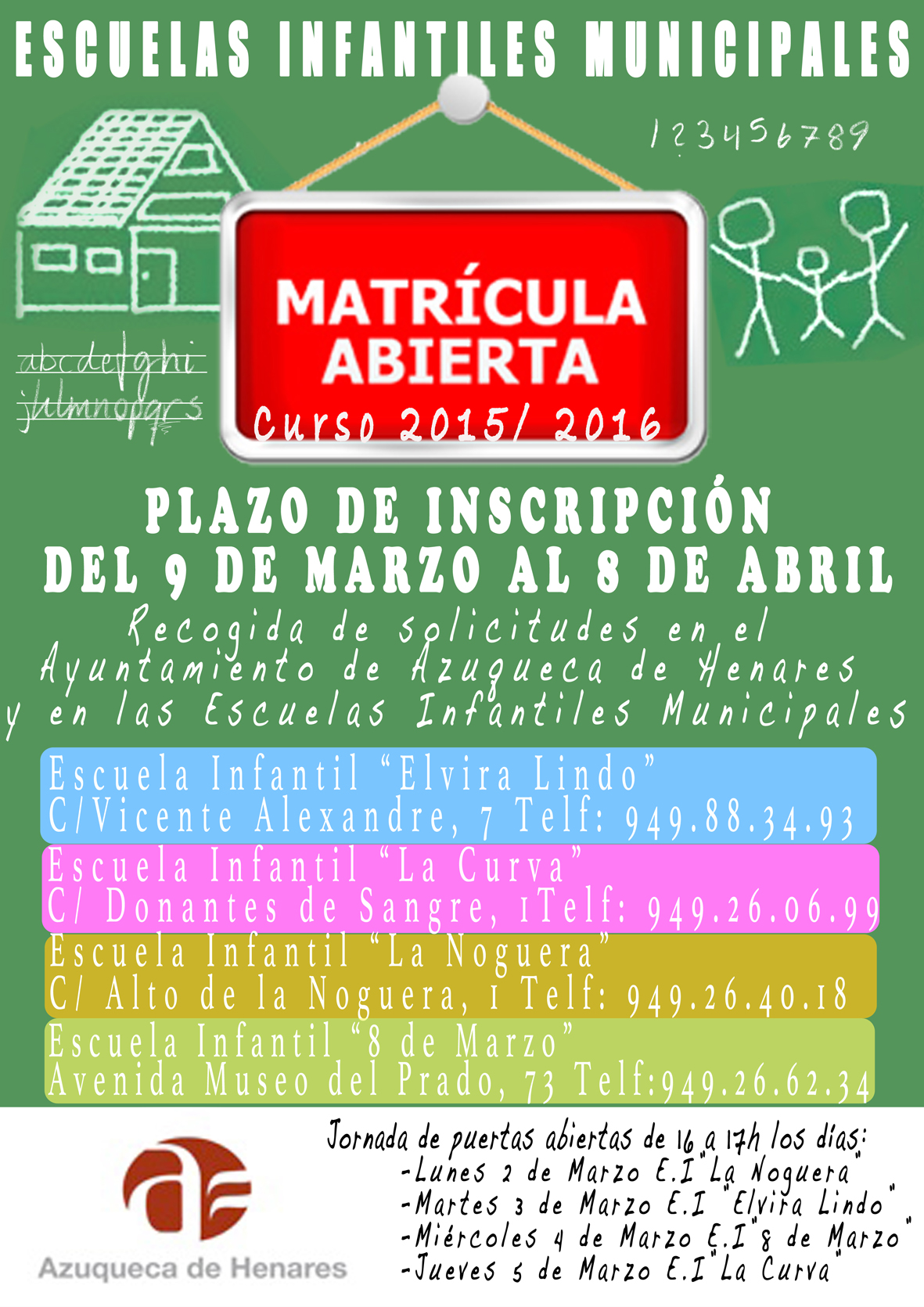 Este lunes, 9 de marzo, se abre el periodo de solicitud de plaza en las Escuelas Infantiles municipales de Azuqueca de Henares de cara al próximo curso. Los interesados pueden recoger los impresos en el Ayuntamiento o en los propios centros de atención a la infancia y entregarlos cumplimentados junto a la documentación requerida en el Servicio de Atención a la Ciudadanía (SAC), de lunes a jueves, de 8 a 19 horas, y los viernes, de 8 a 15 horas. El plazo de presentación de solicitudes se cierra el miércoles 8 de abril.La concejala de Educación e Infancia, Elisa Cansado, ha recordado que "son cuatro las guarderías de titularidad municipal -8 de marzo, La Noguera, Elvira Lindo y La Curva- que ofrecen un servicio excepcional y de calidad a las familias del municipio con niños de 0 a 3 años". Con el fin de que los interesados conocieran las instalaciones, los centros han realizado jornadas de puertas abiertas entre los días 2 y 5 de marzo. "Fuera de esas sesiones, las familias pueden dirigirse a los centros o al Ayuntamiento para resolver cualquier duda", resalta Cansado.Una vez que finalice el plazo de presentación de solicitudes (el día 8 de abril), el calendario para la adjudicación de plazas es el siguiente:- 28 al 14 de abril, revisión