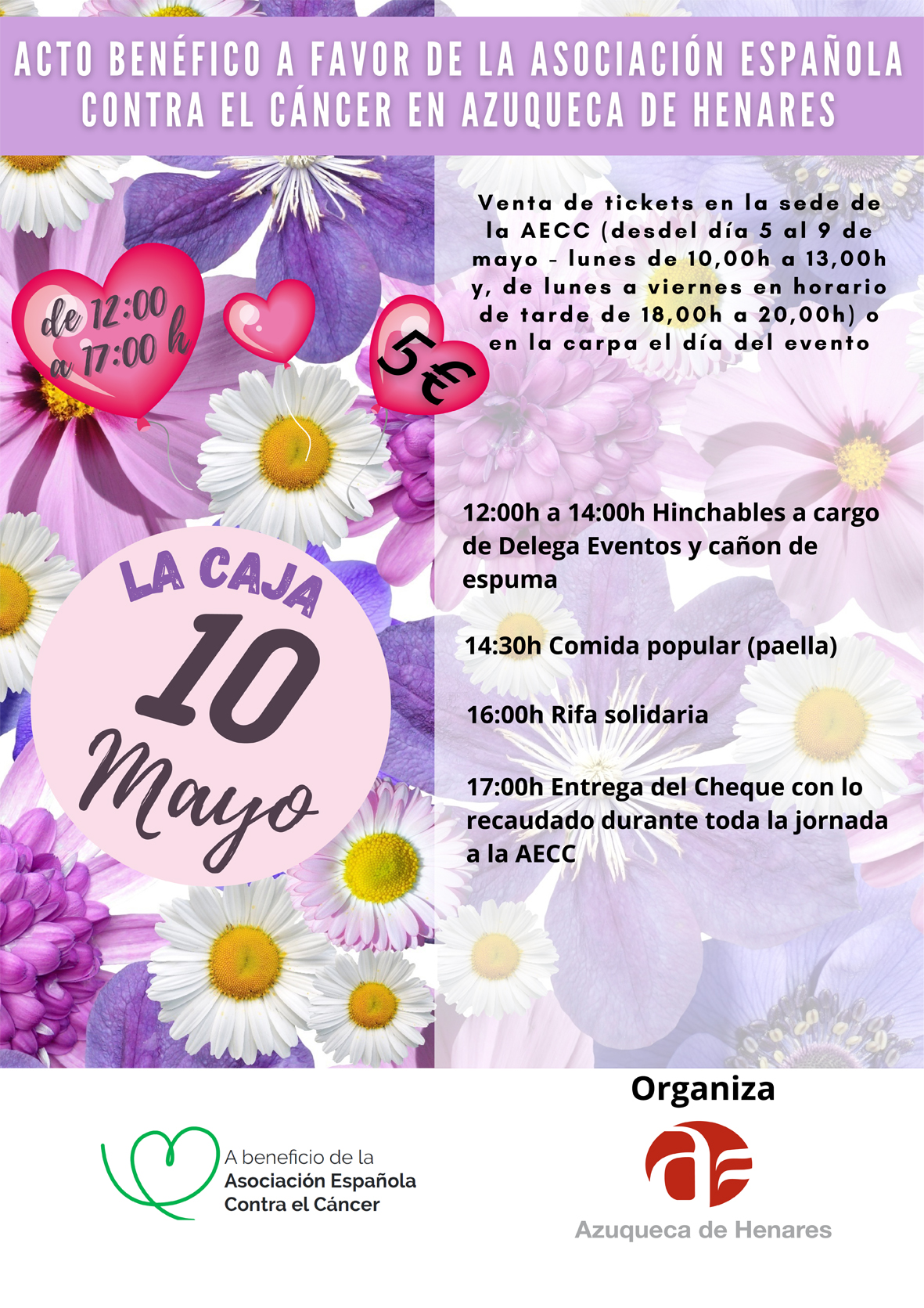 La concejala de Fiestas, Charo Martín, detalla en qué consiste esta jornada, que se desarrollará entre las 12 y las 17 horas, en el nuevo espacio municipal La Caja -se ha cambiado de ubicación por la previsión de lluvia-. “Es una propuesta abierta para todas las edades, incluido el público infantil, que podrá disfrutar de hinchables y un cañón de espuma de 12 a 14 horas”, afirma. Además, a partir de las 14:30 horas, se servirá la comida popular: una paella. Los vales están a la venta de manera anticipada en el local de la AECC, ubicado en un local exterior del edificio El Foro, con acceso desde la calle Pobos, por las tardes, hasta el viernes 9, de 18 a 20 horas, y el mismo sábado, en la carpa. El precio es de 5 euros e incluye comida, pan y agua. “Toda la recaudación se donará de manera íntegra a la Asociación Española Contra el Cáncer en Azuqueca”, insiste la edil. A las 16 horas, se ha programado una rifa solidaria y a las 17 horas, se entregará el cheque con el dinero recaudado a AECC en Azuqueca.