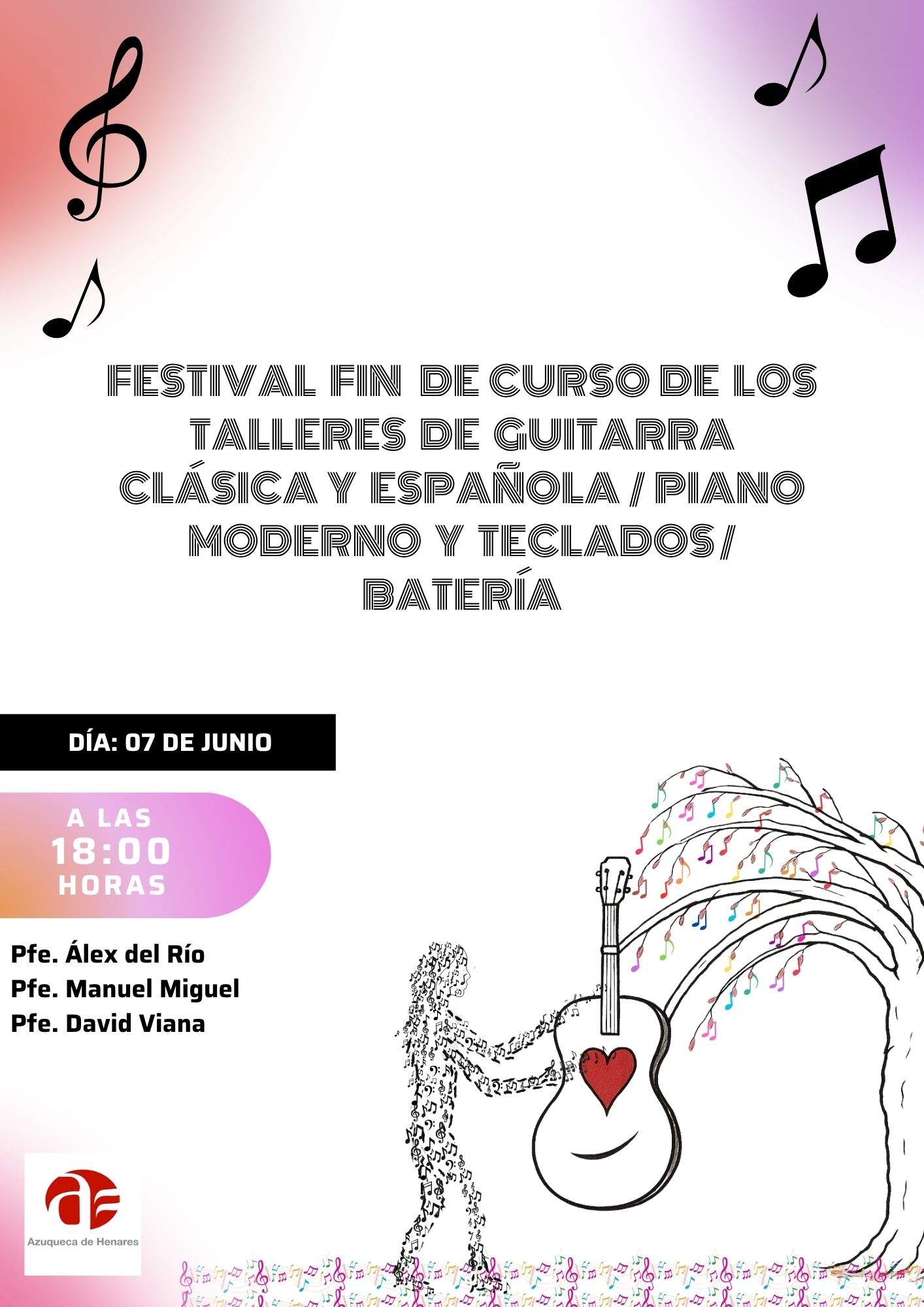 7 junio a las 18 h, festival taller de guitarra clásica y española, teclados y batería (pfs. Álex del Río, Manuel Miguel y David Viana) en el salón de actos de la Casa de la Cultura
