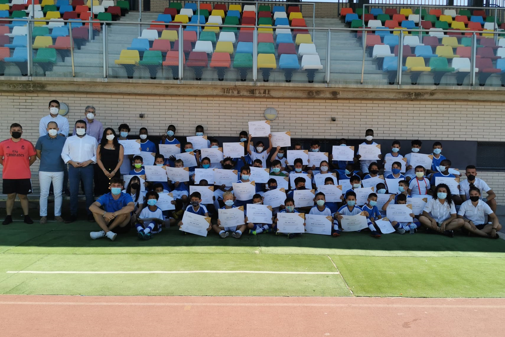 Este viernes, ha finalizado el Campus Experience organizado por la Fundación Real Madrid, con la colaboración del Ayuntamiento de Azuqueca de Henares y la empresa local Saint-Gobain Isover. Durante toda la semana, 54 niños y niñas con edades comprendidas entre los 6 y los 14 años, han participado en el proyecto, cuyo objetivo es la formación en valores a través del fútbol y que se ha desarrollado en las instalaciones municipales del complejo San Miguel. En la entrega de diplomas a los asistentes han participado el alcalde, José Luis Blanco; la coordinadora del gobierno municipal, Susana Santiago; el concejal de Retos Deportivos, Enrique Pérez de la Cruz y, en representación de Isover, Ricardo Rodríguez, director de Recursos Humanos; y Joaquín Caso, director de Operaciones de la planta de Azuqueca.El primer edil, José Luis Blanco, ha agradecido su colaboración a Saint-Gobain Isover, que ha financiado becas para niñas y niñas en riesgo de exclusión social y también un porcentaje del coste de las inscripciones de los hijos e hijas de los trabajadores de la empresa. "Gracias a la aportación de Saint-Gobain Isover, pequeñas y pequeños de Azuqueca en riesgo de exclusión han podido participar en esta propuesta", resume el regidorPor su parte, el concejal de Retos Deportivos, Enrique Pérez de la Cruz, ha señalado que esta propuesta "ha complementado la oferta deportiva del Ayuntamiento: las Escuelas Municipales que funcionan durante el curso y el programa Azuverano que se va a prolongar durante todas las vacaciones escolares".