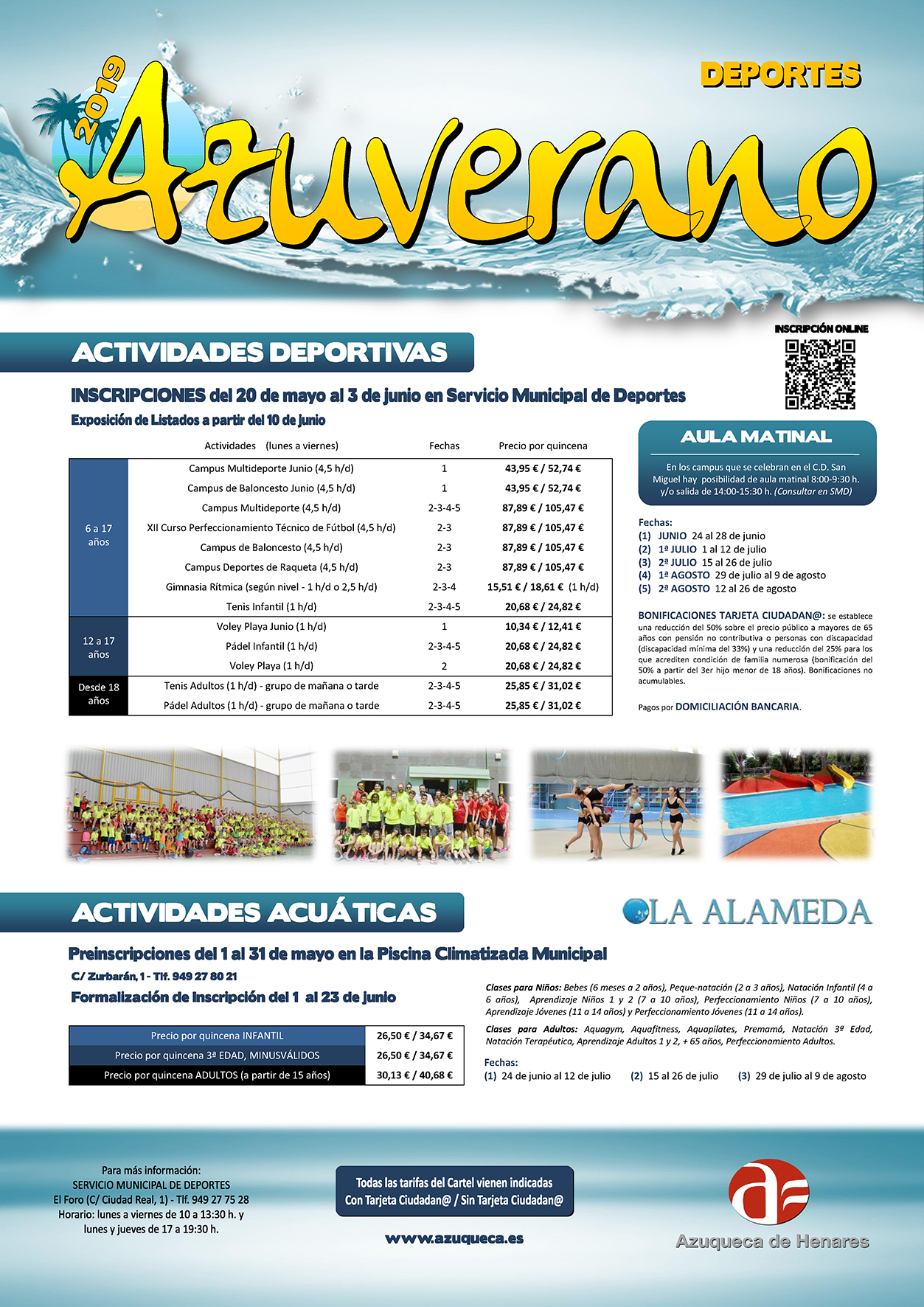 Desde este lunes, se pueden formalizar las inscripciones en las distintas propuestas del programa deportivo Azuverano que organiza el Ayuntamiento desde el 24 de junio (primer lunes de vacaciones escolares) y hasta finales de agosto. El plazo está abierto hasta el día 3 de junio, en el Servicio Municipal de Deportes (en El Foro) o en la piscina climatizada municipal, en el caso de las actividades acuáticas.En el apartado de actividades deportivas, se ofrecen para las edades comprendidas entre los 6 y los 17 años campus multideporte, campus de baloncesto, un curso de perfeccionamiento técnico de fútbol, campus de deporte de raqueta, gimnasia rítmica y tenis infantil. En el caso de los jóvenes de 12 a 17 años, el Azuverano incluye voley playa y pádel infantil y, para los adultos (a partir de 18 años) se ofrece tenis y pádel. Con el objetivo de facilitar la conciliación familiar y laboral, en los campus que se celebran en el complejo deportivo San Miguel se ofrece el servicio de aula matinal de 8 a 9:30 horas y de salida, de 14 a 15:30 horas (consultar en el Servicio Municipal de Deportes).Para las actividades acuáticas en la piscina climatizada, el plazo de inscripción está abierto hasta el 31 de mayo, en las instalaciones de la propia piscina. La formalización de la inscripción se hará entre el 1 y el 23 de junio. Se ofrecen clases para bebés, niños en distintos niveles y adultos. La programación incluye también aquagym, aquafitness, aquapilates, premamá, natación para mayores y natación terapéutica.Información sobre precios y quincenas, en imagen adjunta y en el Servicio Municipal de Deportes (SMD), en El Foro (de lunes a viernes, de 10 a 13:30  y lunes y jueves de 17 a 19:30 horas; teléfono 949 27 75 28).