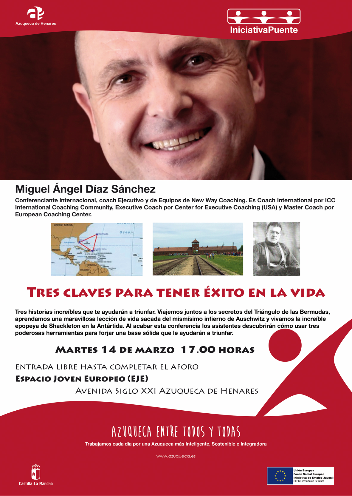 La tercera de las lecciones magistrales programadas por el Ayuntamiento de Azuqueca de Henares a través del programa Iniciativa Puente llega este martes, día 14, de la mano de Miguel Ángel Díaz. Bajo el título 'Tres claves para tener éxito en la vida', este conferenciante hablará de liderazgo, en el Espacio Joven Europeo (EJE), a las 17 horas. La sesión se dirige a jóvenes, profesores, docentes y, en general, a cualquier persona que desee aprovechar al máximo sus capacidades y sus competencias personales o individuales.Miguel Ángel Díaz Sánchez es coach ejecutivo y de equipos de New Way Coaching, coach international por ICC (International Coaching Community), executive coach por Center for Executive Coaching (USA) y master coach por European Coaching Center. En su lección magistral presentará tres historias "increíbles" que ayudan a triunfar y que se desarrollan en el Triángulo de las Bermudas, la Antártida y el campo de exterminio de Auschwitz (Polonia). El objetivo es que el público descubra "cómo usar tres poderosas herramientas para forjar una base sólida que le ayudarán a triunfar", según ha adelantado el propio Miguel Ángel Díaz.Retención del talento y capacitación'Iniciativa Puente' es el programa puesto en marcha por el Ayuntamiento de Azuqueca con el objetivo de mejorar la capacitación de los jóvenes y de retener el talento loca. Colaboran con el Ayuntamiento la Universidad de Alcalá y la Junta de Comunidades de Castilla-La Mancha, además de los institutos del municipio. De manera paralela a las lecciones magistrales dirigidas al público en general, el programa ofrece en las aulas de los centros de Secundaria las denominadas 'píldoras formativas de alto impacto'. 'Iniciativa Puente' funciona también como intermediación entre formación y empleo y ofrece asesoramiento a jóvenes emprendedores.