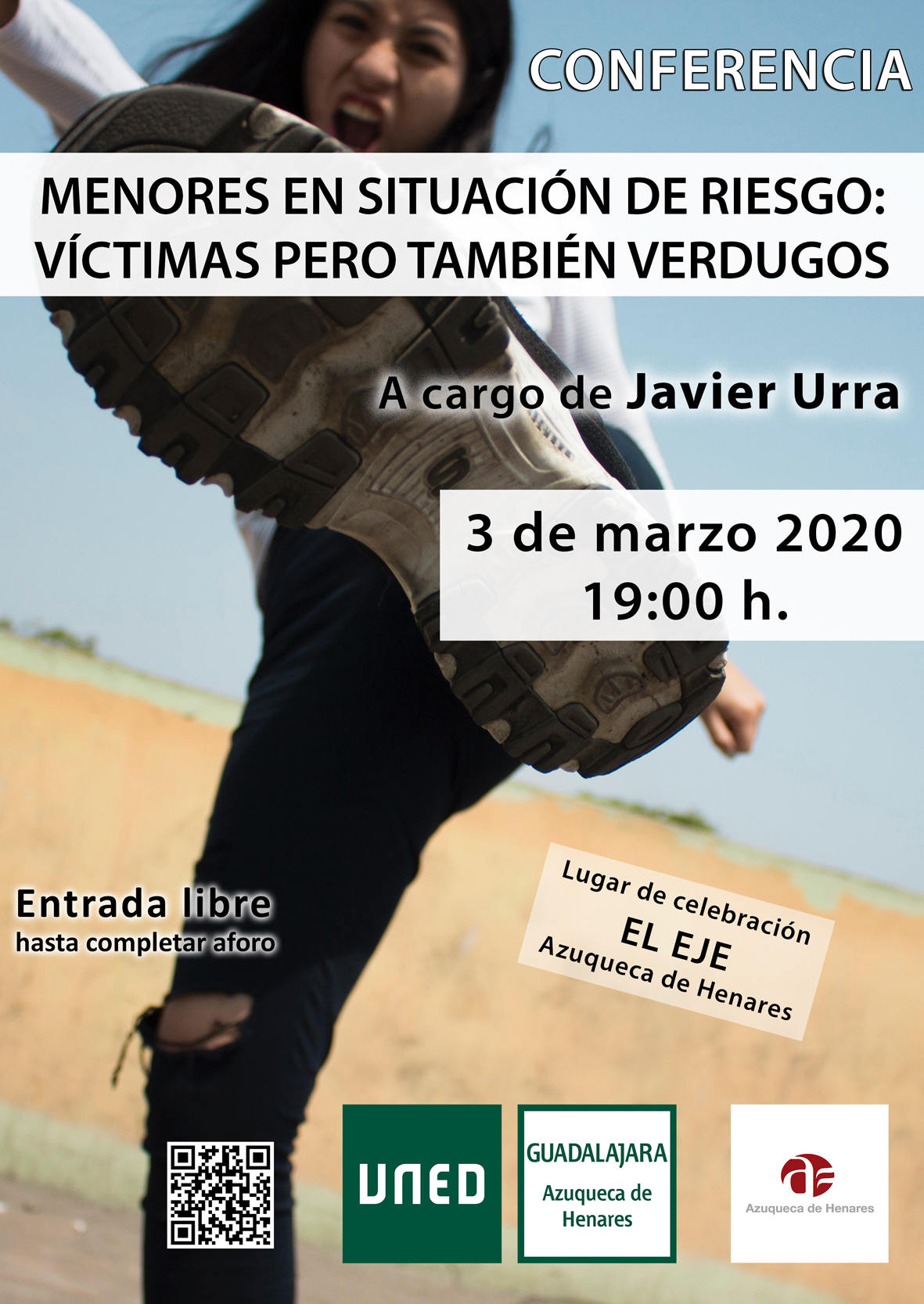 La sala de cine del Espacio Joven Europeo (EJE) de Azuqueca de Henares acogerá el martes 3 de marzo la conferencia 'Menores en situación de riesgo: Víctimas pero también verdugos', a cargo de Javier Urra, psicólogo, escritor y Defensor del Menor de la Comunidad de Madrid entre 1996 y 2001. La actividad comenzará a las 19 horas y está abierta al público en general. La entrada es libre hasta completar el aforo."Esta charla se incluye dentro de la programación que impulsa el Aula de la UNED (Universidad Nacional de Educación a Distancia) en Azuqueca como complemento a las propuestas educativas que se imparten en el edificio de El Foro", apunta la concejala de Educación Global, Susana Santiago, quien lanza una invitación a "educadores, padres, madres y, en general, a todas aquellas personas que, por motivos laborales o personales, estén en contacto con menores o les interese este tema".Susana Santiago recuerda que "desde hace tres cursos y con la colaboración del Ayun tamiento, Azuqueca dispone en El Foro del Aula de la UNED, que depende del Centro Asociado de Guadalajara, con una oferta formativa que incluye el Curso de Acceso para Mayores de 25 y 45 años, el Curso Universitario de Idiomas a Distancia (CUID) en inglés y UNED Senior".