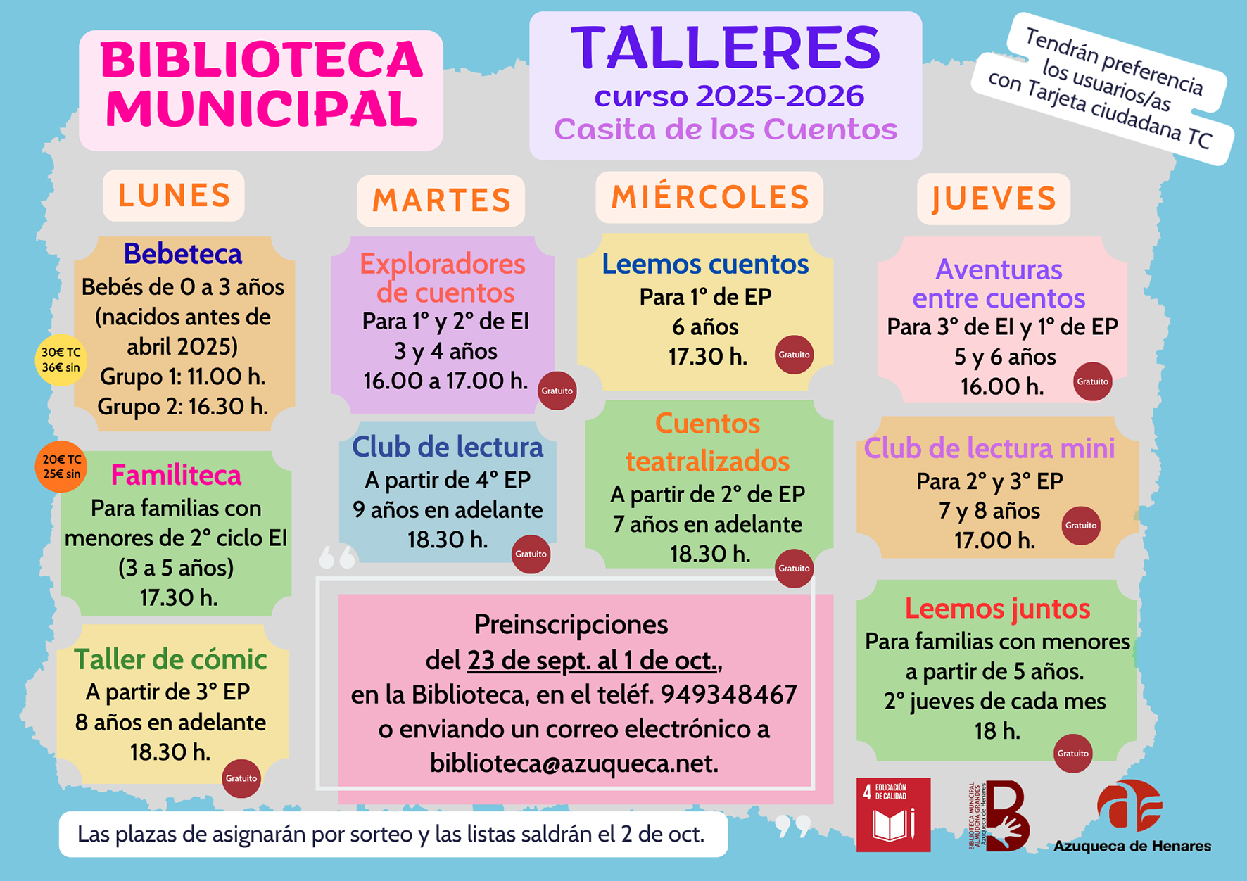 Hasta el miércoles 1 de octubre, está abierto el plazo de preinscripción en los talleres que ha organizado la Biblioteca municipal Almudena Grandes de cara al nuevo curso, 2025-2026, en la Casita de los cuentos Eva Ortiz. Las personas interesadas pueden solicitar su participación de manera presencial en la Biblioteca, en el teléfono 949 34 84 67, o mediante un correo electrónico remitido a biblioteca@azuqueca.net. Las plazas se asignarán por sorteo, tendrán preferencia quienes sean titulares de la Tarjeta Ciudadana municipal y las listas de personas admitidas se publicarán el día 2 de octubre.