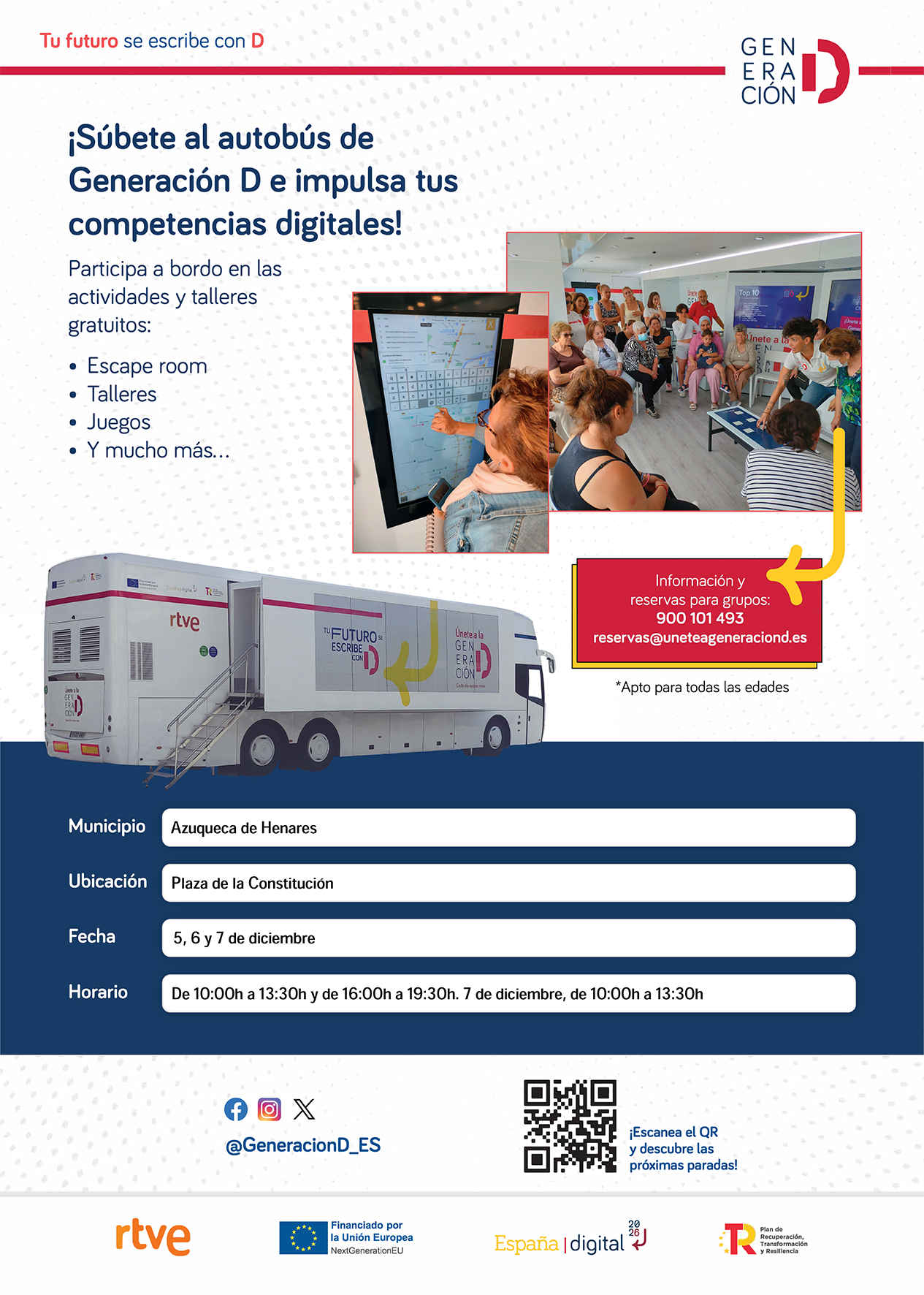 Desde el martes 5 de diciembre y hasta el viernes 7, estará en la plaza de La Constitución de Azuqueca el autobús de la campaña “Generación D”, que impulsa el Gobierno de España a través de RTVE. Azuqueca es la primera parada en la provincia de Guadalajara de esta iniciativa móvil, que cuenta con financiación de los Fondos Next Generation de la Unión Europea. “Se trata de una acción con la que se pretende desarrollar y mejorar las competencias digitales de la ciudadanía, para aprovechar mejor las oportunidades de la digitalización y conocer nuevas herramientas”, explica el alcalde, José Luis Blanco.