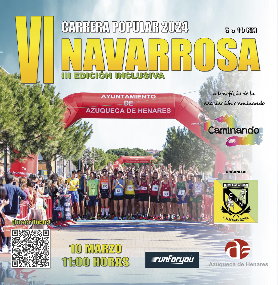 Este miércoles, ha tenido lugar la presentación de la VI Carrera  Popular Inclusiva Navarrosa 2024, que se celebrará el domingo 10 de marzo y que organiza el Club de Atletismo Navarrosa, con el apoyo del Ayuntamiento de Azuqueca, a beneficio de la asociación Caminando. La salida y la meta estarán en el parque de La Quebradilla y se proponen dos distancias, de 5 y 10 kilómetros (una y dos vueltas al circuito, respectivamente), además de carreras para las categorías infantiles. Las inscripciones, que se deben hacer a través de la página web www.inscripcionesdeportivas.com, están abiertas hasta el jueves 7 de marzo.