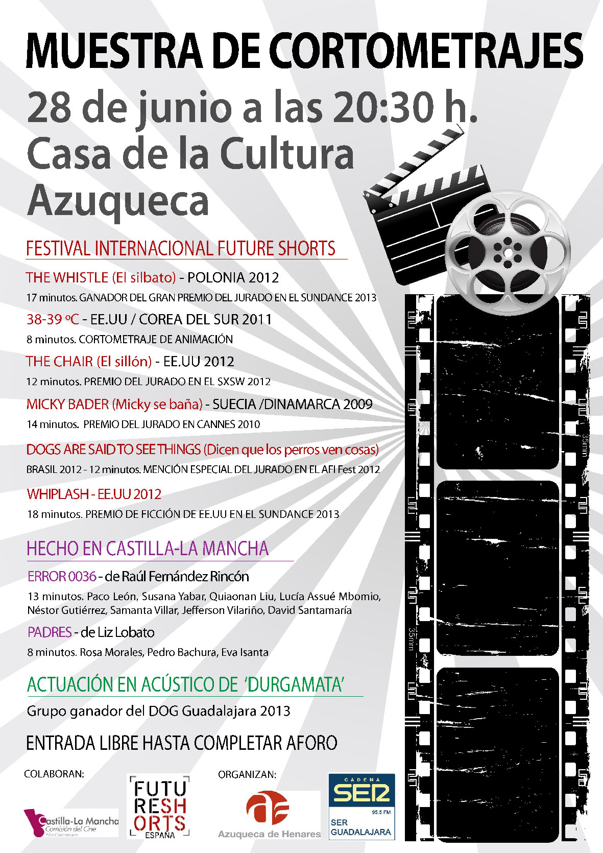 La Casa de la Cultura de Azuqueca de Henares acogerá el viernes, 28 de junio, una muestra de cortometrajes en la que se proyectarán obras que han sido premiadas en los festivales de cine más reconocidos a nivel internacional, como Cannes o Sundance. Además, se podrán ver también dos cortometrajes realizados en Castilla-La Mancha, en concreto, 'error 0036', interpretado entre otros por Paco León, y 'Padres', con la participación de Rosa Morales, Pedro Morales y Eva Isanta.La muestra llega a Azuqueca a través de la colaboración entre el Ayuntamiento azudense y la Cadena SER y se cerrará con el concierto en acústico del grupo 'Durgamata', ganador del festival DOG 2013. La proyección comenzará a las 20:30 h. en el salón de actos de la Casa de la Cultura y la entrada a la misma será libre hasta completar el aforo.La concejala de Cultura, Sandra Yagüe, ha agradecido a la Cadena SER su colaboración para hacer posible que este evento se realice en Azuqueca y ha recordado que ya han llegado a la localidad otras actividades culturales fruto de esa colaboración, como el musical infantil 'La kalabaza de Pippa' o el concierto del grupo 'Calle Salvador'. Asimismo, Yagüe ha animado a todos los aficionados al cine "a no perderse esta muestra, con cortometrajes reconocidos a nivel internacional, que a buen seguro entusiasmarán a quienes asistan".PROGRAMA DE PROYECCIONES:The Whistle (El Silbato): 17 minutos. Ganador del gran premio del jurado en el Sundance 2013.38-39 ºC: 8 minutos. Cortometraje de animaciónThe chair (el sillón): 12 minutos. Ganador del premio del jurado al mejor cortometraje narrativo en el SXSW 2012Micky bader (Micky se baña): 14 minutos. Ganador del premio del jurado en Cannes 2010.Dogs are said to see things (dicen que los perros ven cosas): 12 minutos: Mención especial del jurado en el AFI Fest 2012Whiplash: 18 minutos. Ganador del premio de ficción de EE.UU en el Sundance 2013.Padres: 8 minutos. Con Rosa Morales, Pedro Bachura y Eva Isanta.Error 0036: 13 minutos. Con Paco León y Susana Yabar.