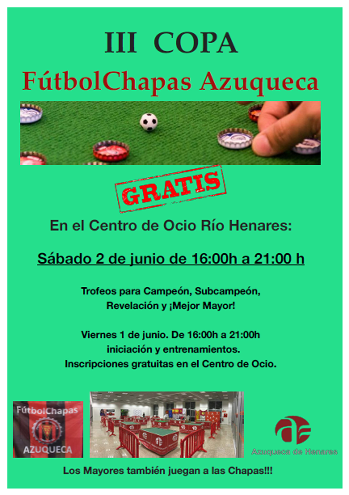 El Club FútbolChapas Azuqueca, con la colaboración del Ayuntamiento, celebra esta sábado, 2 de junio, de 16 a 21 horas, en el Centro de Ocio Río Henares, la III Copa 'FútbolChapas Azuqueca'. "Como novedad, en esta edición, se va a conceder un trofeo al Mejor mayor, es decir, a la persona mayor que quede mejor clasificada", explica la concejala de Promoción de los Mayores, Rufi Fernández, quien aclara que la inscripción es gratuita y se puede tramitar en el Centro de Ocio."Es una actividad en la que se trabaja la coordinación, la psicomotricidad y la concentración, al tiempo que se fomentan las relaciones sociales y el intercambio de experiencias entre participantes, desde niños a jóvenes y adultos", destaca la edil.Además del trofeo al Mejor mayor, en la Copa también se reconocerá al campeón, subcampeón y revelación. De manera previa, el viernes 1 de junio, de 16 a 21 horas, se van a celebrar sesiones de entrenamiento y de iniciación.Resto de propuestas en junioLa Copa de fútbol chapas abre la programación dirigida personas mayores que impulsa el Ayuntamiento de Azuqueca durante el mes de junio. El calendario ofrece las siguientes citas (más información e inscripciones, en el Centro de Ocio): - Miércoles 6 de junio, a las 17 horas: Videofórum y proyección de la película 'Siempre Alice'.