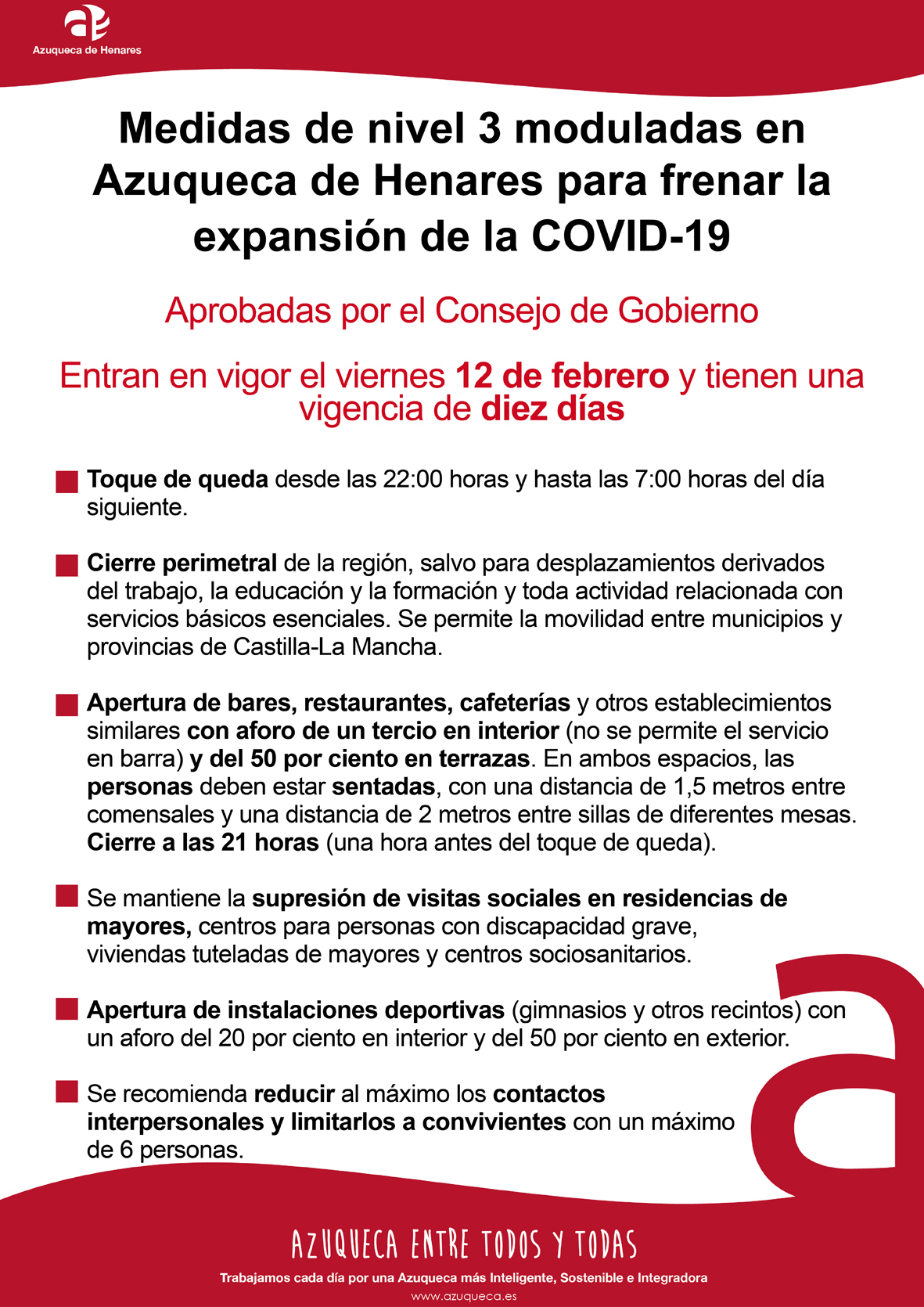 El consejo de Gobierno de Castilla-La Mancha ha aprobado este jueves, 11 de febrero, modular las medidas establecidas para prevenir contagios por la COVID-19, ante el descenso de casos que se ha registrado en los últimos días. El consejero de Sanidad del gobierno regional, Jesús Fernández, ha explicado que la región pasa desde esta medianoche de 'Nivel 3 reforzado' a 'Nivel 3 especial', con la salvedad de los municipios de Fuensalida, Torrijos y Casarrubios, que se mantienen en el nivel reforzado.Esto supone que se permitirá la movilidad entre municipios de todo el territorio regional (desaparece la perimetración por localidades), podrá reabrir al sector de la hostelería -terrazas al 50 por ciento e interior a un tercio, con la prohibición de consumir de pie o en barra y respetando distancias interpersonales y medidas higiénicas-, podrán abrir también las superficies comerciales de más de 300 metros -con limitación de un tercio de aforo- y se permite la apertura de bibliotecas, museos y archivos, con un tercio de aforo.Las instalaciones deportivas (gimnasios y otros recintos) se pueden abrir con un aforo del 20 por ciento en interior y del 50 por ciento en exterior. Las piscina municipal y otras instalaciones recreativas de uso público se mantienen cerradas.El toque de queda se mantiene a las 22 horasSe mantiene el toque de queda a las 22 horas y los establecimientos de hostelería deberán cerrar una hora antes, a las 21 horas. También se mantienen las limitaciones de acceso a los centros sociosanitarios, en actividades religiosas y de ámbito social. Continúa en vigor la limitación de 6 personas como máximo por grupo, al tiempo que la Junta recomienda seguir limitando los contactos personales. "Las medidas y la restricción de la movilidad han dado frutos", ha dicho el consejero, que ha añadido que pese a la evolución positiva de los datos "no ha terminado nada".Fernández ha detallado que la incidencia acumulada a 14 días en Castilla-La Mancha ha descendido hasta 644 casos por cien mil habitantes y la de 7 de días se ha reducido hasta 194 casos, por debajo de la media nacional (210). "Los datos van bajando claramente, pero no lo suficiente para que la relajación de las medidas no vaya a ser modulada", ha dicho Fernández.