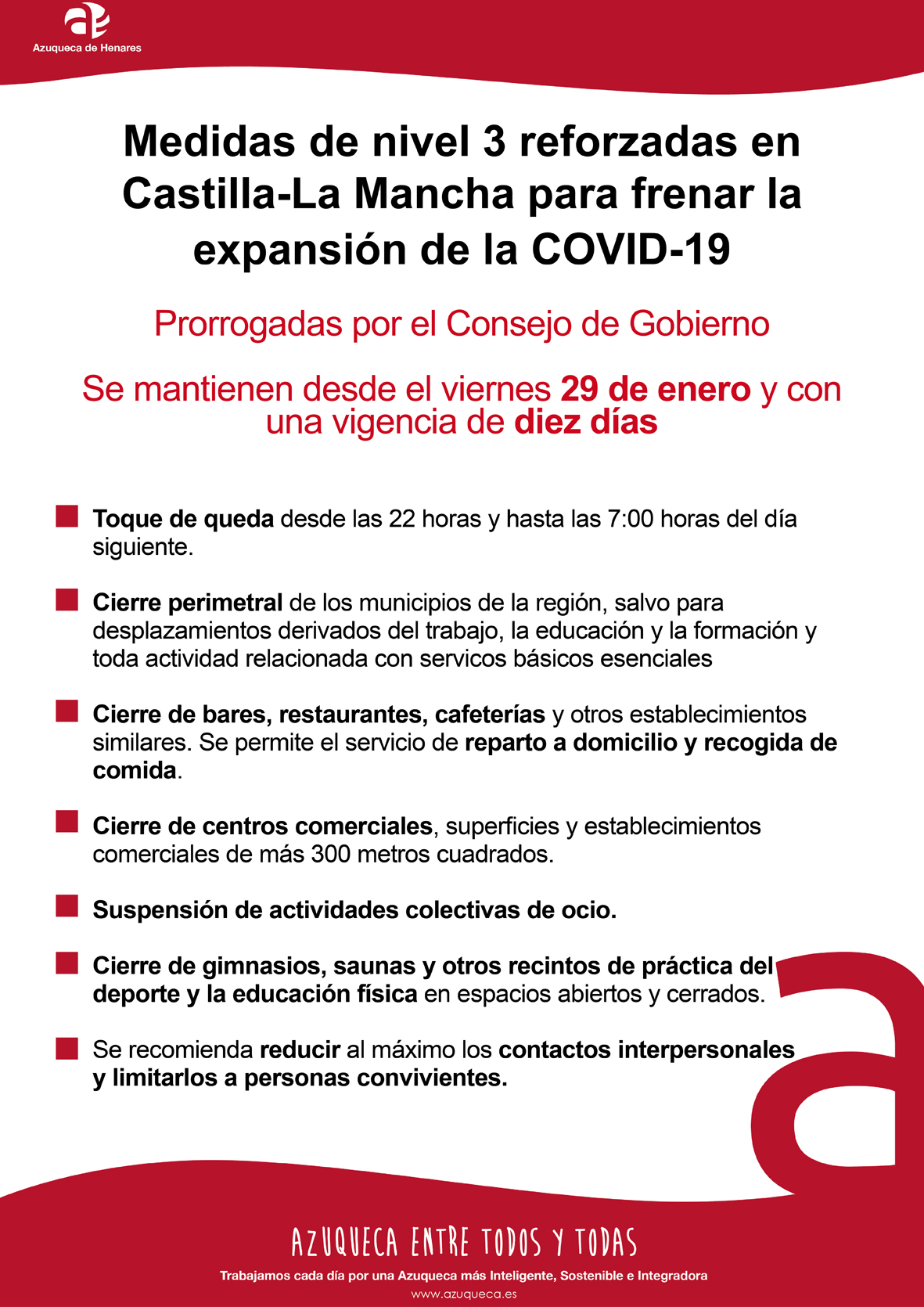 El Consejo de Gobierno de Castilla-La Mancha ha aprobado este jueves la prórroga de las medidas de nivel 3 reforzado para toda la región aprobadas el pasado 19 de enero, con el objetivo de tratar de frenar la expansión de contagios de COVID-19. De este modo, se mantiene el toque de queda en todo el territorio castellanomanchego a las 22 horas (hasta las 7 horas) y el cierre perimetral de los municipios de la región (no se puede salir ni entrar en Azuqueca ni en el resto de localidades de la región, salvo para desplazamientos derivados del trabajo, la educación y la formación y/o con servicios básicos esenciales).Se mantiene por tanto el cierre de bares, restaurantes, cafeterías y otros establecimientos similares, tanto en su interior como en el exterior (terrazas). Tampoco podrán desarrollar su actividad los locales de apuestas. La Junta mantiene también el cierre de centros comerciales, superficies y establecimientos comerciales de más 300 metros cuadrados (excepto las áreas de alimentación, higiene y otros productos considerados esenciales).Asimismo, se mantiene la suspensión de todo tipo de actividades culturales y de ocio.También siguen clausurados gimnasios, saunas y otros recintos de práctica del deporte y la educación física, tanto en espacio abierto como cerrado.De manera añadida a estas restricciones, la autoridad sanitaria recomienda a la ciudadanía reducir al máximo los contactos interpersonales y limitarlos a las personas convivientes.