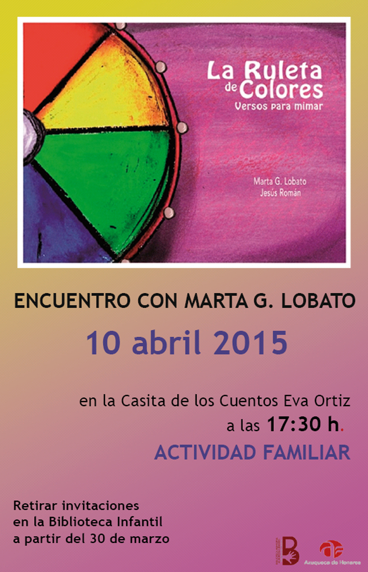 El programa de actos del Día del Libro, que se celebra el 23 de abril, comienza este viernes día 10 con la presentación de La ruleta de colores. Versos para mimar, que contará con la presencia de la autora, Marta G. Lobato. El libro, que ha sido ilustrado por Jesús Román, recoge ocho poemas dedicados a un color diferente cada uno de ellos. La sesión dará comienzo a las 17:30 horas en la Casita de los Cuentos. La siguiente cita del Día de Libro en Azuqueca es el martes 14 de abril, con una nueva entrega del programa 'Merienda de cuentos', para niños y niñas de 3 a 8 años. Las invitaciones para asistir están disponibles en la sala infantil de la Biblioteca Municipal.El programa elaborado por el Ayuntamiento con motivo del Día del Libro se prolonga hasta el 25 de abril, e incluye un encuentro con la escritora Almudena Grandes, así como sesiones de cuentos, la Lectura Continuada de El Quijote, un maratón de poesía y juegos literarios, entre otras propuestas.Actividades del Día del Libro 2015