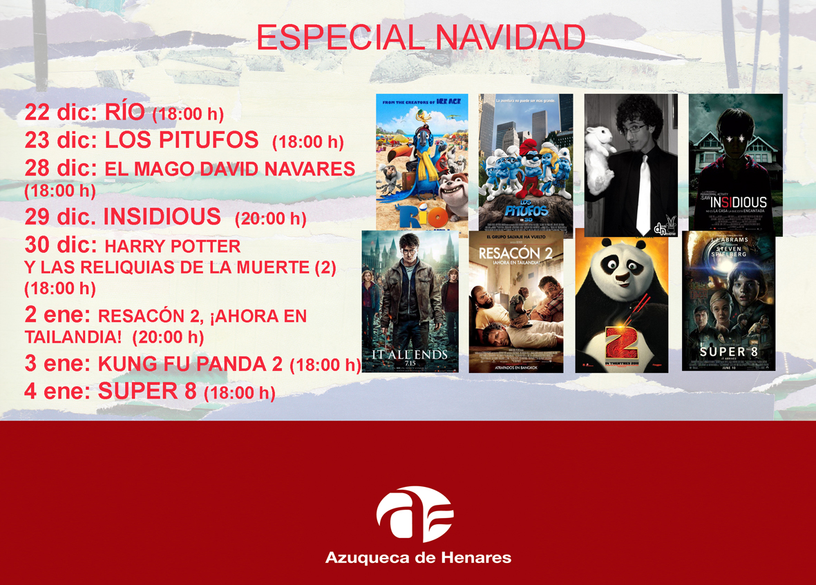 El Ayuntamiento de Azuqueca de Henares impulsa del 22 de diciembre al 4 de enero una programación cultural especial con motivo de la Navidad. En concreto, el salón de actos de la Casa de la Cultura va a acoger la proyección de siete películas, así como un espectáculo de magia. “Hay propuestas para todos los públicos, aunque se presta una especial atención a los más pequeños y a los jóvenes pues en estas fechas se encuentran de vacaciones y disponen de más tiempo libre”, señala la concejala de Cultura, Sandra Yagüe.En cuanto a la cartelera de cine, las sesiones para los más pequeños comienzan a las 18 horas y los títulos elegidos son ‘Río’ (jueves 22 de diciembre), ‘Los Pitufos’ (viernes 23), ‘Harry Potter y las reliquias de la muerte (parte II)’ (viernes 30), ‘Kung Fu Panda 2’ (martes 3 de enero) y ‘Super 8’ (jueves 4).Por otra parte, las propuestas para el público juvenil y adulto son ‘Insidious’ (jueves 29 de diciembre) y ‘Resacón 2, ¡Ahora en Tailandia!’ (lunes 2 de enero), ambas, a las 20 horas.“Además, el miércoles 28, a las 18 horas, el mago David Navares subirá al escenario de la Casa de la Cultura para ofrecer un espectáculo de magia con toques de humor”, detalla la edil azudense.En todos los casos, el precio de las actividades es de 2 euros para adultos y jóvenes a partir de 15 años, y de 1 euro para niños hasta 14 años. Las entradas se pueden adquirir de manera anticipada a través de la web municipal www.azuqueca.es (pinche aquí) y en los cajeros habilitados, o el mismo día de las sesiones, en la taquilla del Centro, una hora antes del inicio.