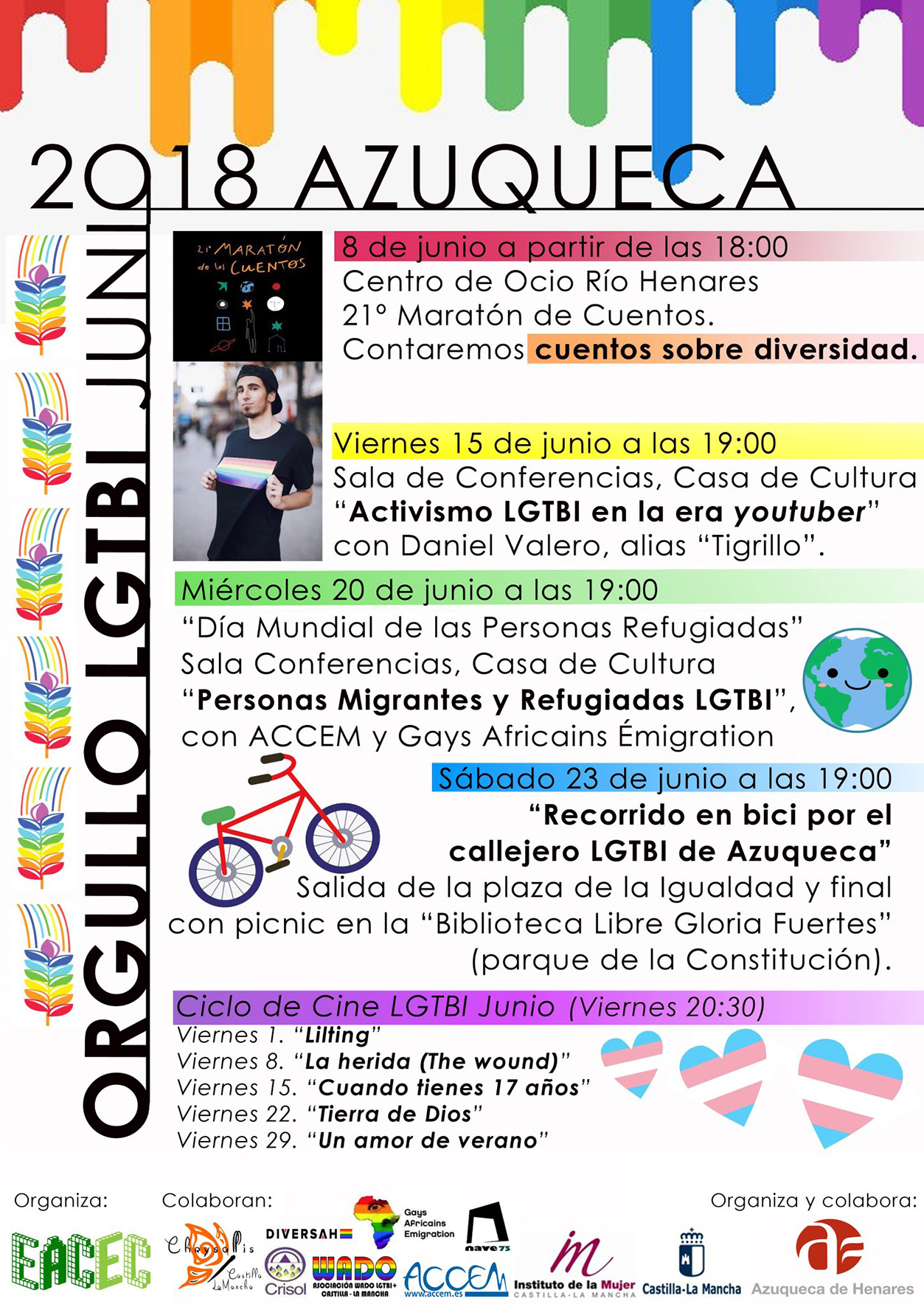 La asociación cultural y LGTBI de Azuqueca de Henares EACEC ha organizado distintas actividades este mes para celebrar el Orgullo LGTBI. El viernes, representantes de las asociaciones DiversAH, Crisol, Crisalis y Wado participaron en el Maratón de Cuentos de Azuqueca, en el Centro de Ocio Río Henares, contando cuentos sobre diversidad, cuatro de ellos de manera colectiva y tres individualmente.El Ayuntamiento se sumará a las reivindicaciones y a la visibilización de este colectivo colocando la bandera LGTBI en el balcón del Ayuntamiento el próximo día 28. Hace ahora dos años, el 9 de junio de 2016, el Pleno del Ayuntamiento de Azuqueca aprobó por unanimidad una moción presentada por los grupos municipales del PSOE y de Ciudadanos con el fin de prevenir la discriminación por motivos de orientación sexual o afectiva y para favorecer la visibilidad de la diversidad sexual. "Apostamos por una Azuqueca tolerante, solidaria y diversa", ha dicho el alcalde, José Luis Blanco.Otras actividadesEn el programa organizado por EACEC, para este viernes, día 15, se ha previsto una charla titulada 'Activismo LGTBI en la era youtuber', a cargo de Daniel Valero, conocido como 'Tigrillo'. El acto se desarrollará en la sala de conferencias de la Casa de la Cultura, desde las 19 horas. El miércoles 20 de junio se desarrollará una actividad centrada en la situación de las 'Personas Migrantes y refugiadas LGTBI', con motivo del 'Día mundial de las personas refugiadas'. En la sala de conferencias de la Casa de la Cultura se abordará este tema en un acto en el que colaboran ACCEM y el colectivo Gays Africains Émigration.El programa incluye también el día 23 de junio un recorrido en bici siguiendo el callejero LGTBI de Azuqueca. Se saldrá desde la plaza de la Igualdad, a las 19 horas y el acto se cerrará con un picnic en el parque de La Constitución, junto a la Biblioteca Libre Gloria Fuertes que se ponía en marcha hace unas semanas. Allí, los participantes harán propuestas de nombres para su futura incorporación al callejero de Azuqueca, que después serán trasladadas al Ayuntamiento.Ciclo de cineAdemás, durante este mes, el ciclo de cine municipal se centra en la temática LGTBI. El día 1 se proyectó la película 'Lilting'; el día 8, 'Cuando tienes 17 años'; el próximo viernes se podrá ver 'La herida (The Wound)'; el día 22, 'Tierra de Dios'; y el último viernes de mes, el 29, se proyectará 'Un amor de verano'. Todas las películas se proyectan en la sala de cine del EJE, a las 20:30 horas. Venta de entradas, en los cajeros ciudadanos y a través de esta página (AQUÍ).