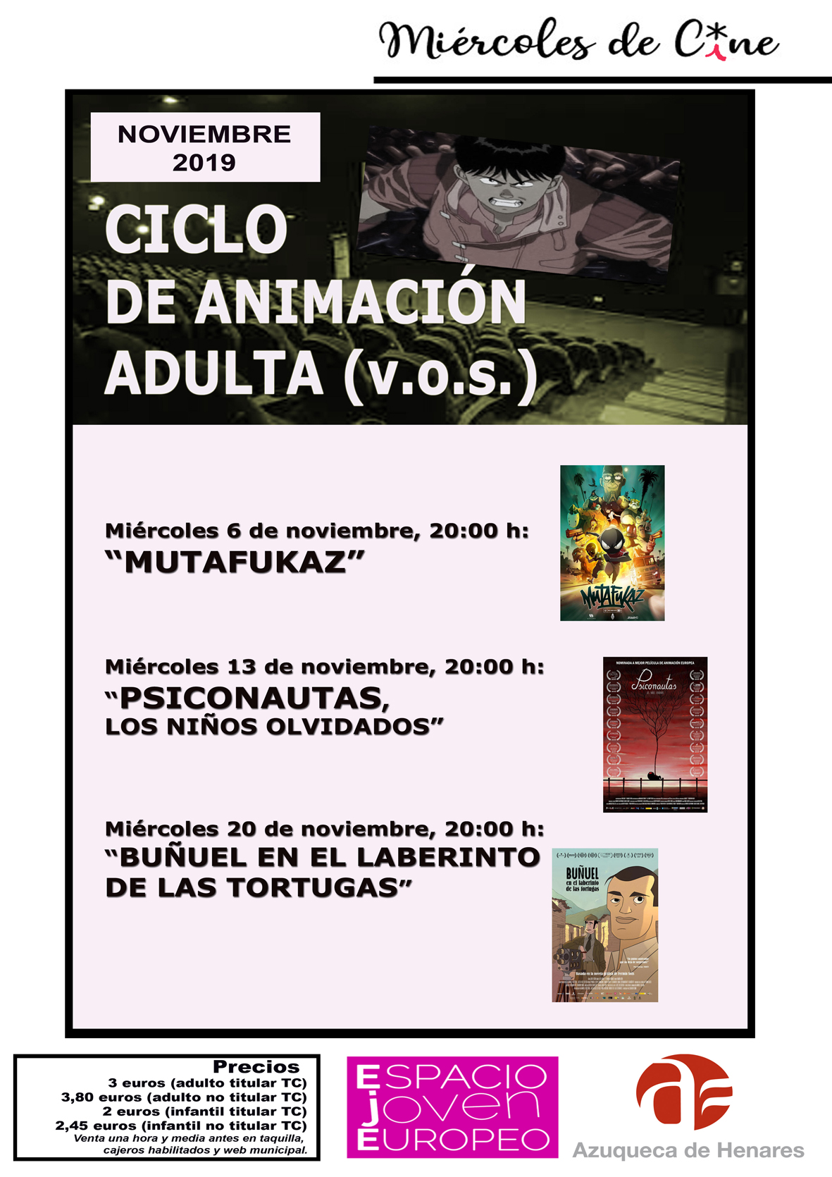 El Ayuntamiento de Azuqueca de Henares lanza en noviembre los denominados 'Miércoles de cine'. "Se trata de una propuesta cultural que da continuidad a los ciclos en versión original con subtítulos que se venían programando con caracter mensual", explica la concejala de Educación Global, Susana Santiago, quien añade que "la principal novedad consiste en que las proyecciones van a ser los miércoles -hasta ahora eran los viernes-".Los 'Miércoles de cine' se estrenan en noviembre con un ciclo de animación adulta con sesiones los miércoles, a las 20 horas, en la sala del Espacio Joven Europeo (EJE). La cartelera incluye las películas 'Mutafukaz' (día 6), 'Psiconautas, los niños olvidados' (día 13) y 'Buñuel en el laberinto de las tortugas' (día 20). "Además, el miércoles 27, se proyectará una película dentro de los actos del 25 de Noviembre, Día Internacional contra la Violencia de Género", avanza la edil.El precio de las entradas para los adultos es de 3 euros con Tarjeta Ciudadana y de 3,80 euros sin este documento municipal, mientras que el público infantil debe abonar 2 y 2,45 euros, respectivamente. Las localidades se pueden adquirir en esta página web (pinche AQUÍ), los cajeros ciudadanos y las sobrantes, en taquilla, el mismo día, desde las 18:30 horas.