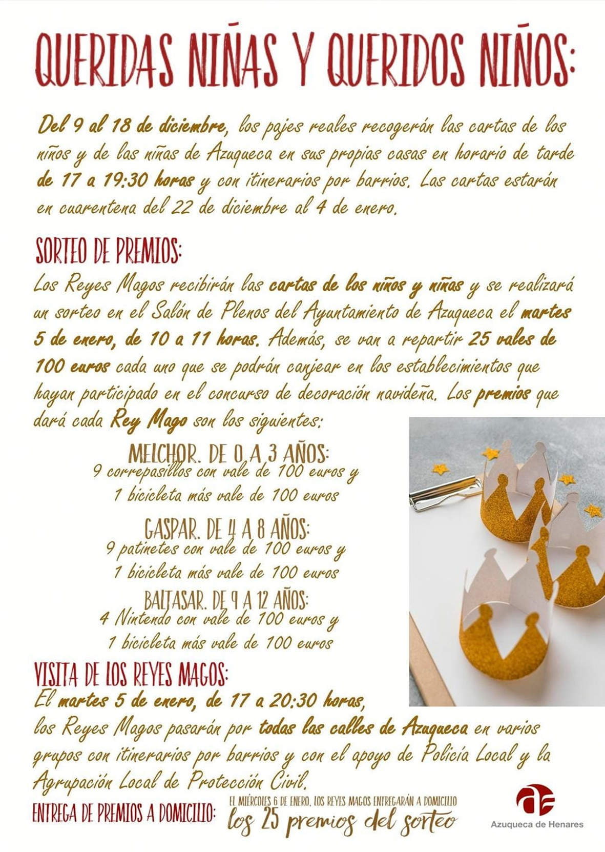 Melchor sorteará premios para los menores de 0 a 3 años (9 correpasillos con vale de 100 euros y 1 bicicleta más vale de 100 euros), Gaspar para niños y niñas de 4 a 8 años (9 patinetes con vale de 100 euros y 1 bicicleta más vale de 100 euros) y Baltasar, para el público de 9 a 12 años (4 Nintendo con vale de 100 euros y 1 bicicleta más vale de 100 euros). "Estos premios se entregarán el 6 de enero en el domicilio de los ganadores", aclara la concejala de Desarrollo Saludable.Visita de los Reyes MagosEn la tarde del 5 de enero, de 17 a 20:30 horas, en lugar de la tradicional cabalgata, que no se celebrará por la situación sanitaria, sus majestades Melchor, Gaspar y Baltasar recorrerán Azuqueca para que el público infantil pueda saludarles. "Está previsto que se organicen varios grupos con itinerarios por barrios y con el apoyo de Policía Local y la Agrupación Local de Protección Civil", avanza la edil, al tiempo que pide colaboración y responsabilidad a las familias.