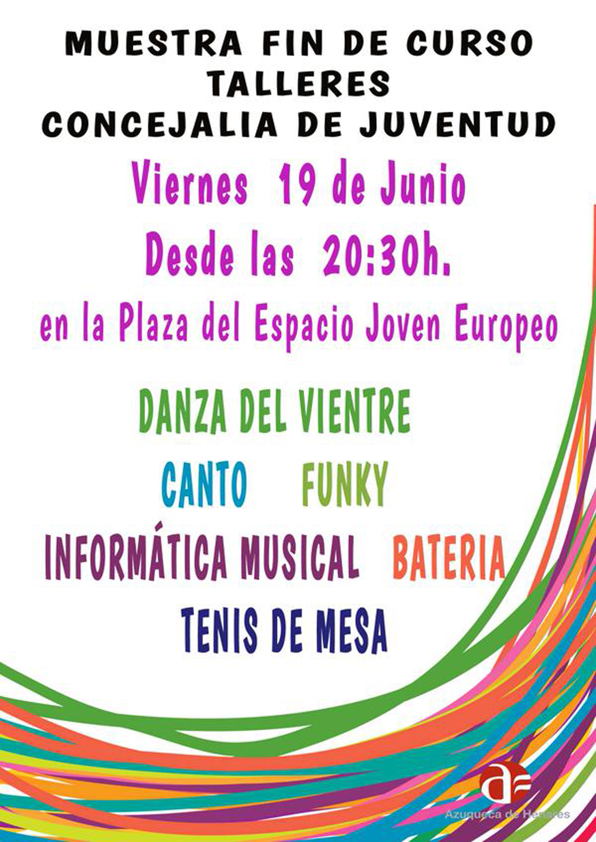La plaza del Espacio Joven Europeo acoge este viernes, 19 de junio, la fiesta de fin de curso de los talleres anuales que el Ayuntamiento de Azuqueca de Henares oferta para jóvenes de 12 a 35 años. Desde las 20:30 horas, se va a poder disfrutar de una muestra en la que participa el alumnado de las distintas actividades, en concreto, de Funky, Danza del vientre, Canto, Batería, Informática musical y Tenis de mesa.De cara al curso 2015/2016, este jueves 18, se cierre la plazo de renovación de matrícula para el antiguo alumnado. En el caso de las nuevas incorporaciones, las personas interesadas pueden presentar su solicitud desde el lunes 22 al martes 30 de junio. Los trámites deben realizarse en la Oficina Municipal de Información Juvenil (OMIJ), ubicada en la planta baja de El Foro, o bien, llamar al teléfono 949 277 520 o escribir al correo electrónico