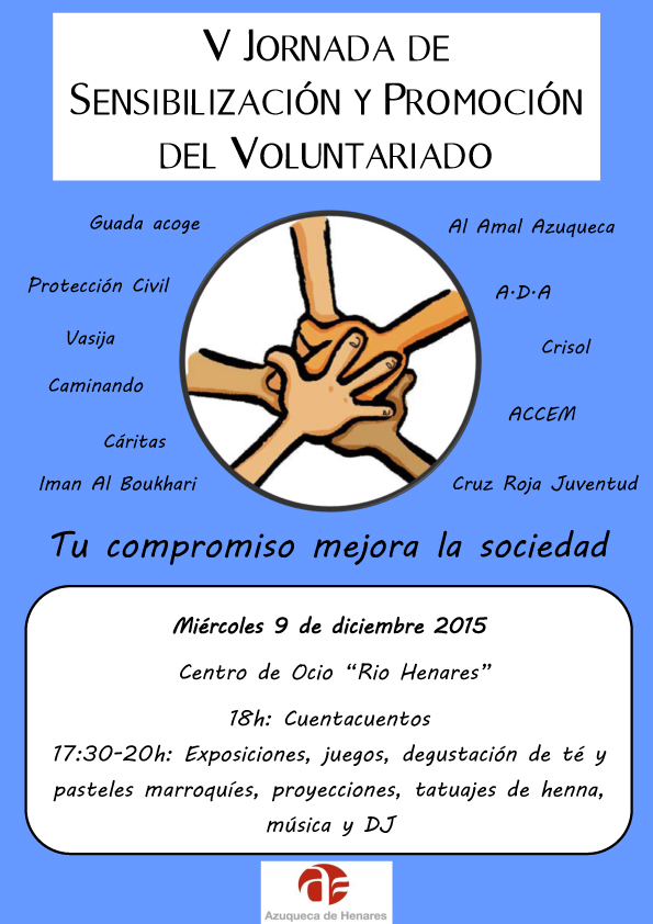El próximo miércoles, 9 de diciembre, se celebrará en el Centro de Ocio Río Henares la quinta edición de la 'Jornada de sensibilización y promoción del voluntariado' que organiza el Ayuntamiento de Azuqueca de Henares. Bajo el lema 'Tu compromiso mejora la sociedad', está previsto que se desarrollen entre las 17:30 y las 20 horas distintas actividades (exposiciones, juegos, degustación de té y pasteles marroquíes, proyecciones, tatuajes de henna y música) y a las 18 horas se ha programado un cuentacuentos. La concejala de Colaboración Ciudadana, Rufi Fernández, ha recordado que "como en las anteriores cuatro ediciones, el objetivo de este encuentro es ofrecer a las asociaciones y organizaciones locales un espacio para compartir experiencias y proyectos, además de dar a conocer sus objetivos a toda la población".En la jornada han confirmado su participación los siguientes colectivos locales: Guada Acoge, Protección Civil, Vasija, Caminando, Cáritas, Imán Al Boukhari, Al Amal Azuqueca, ADA, Crisol, Accem y Cruz Roja Juventud.Segunda jornada de formaciónAdemás, el día 9 se celebra el segundo de los cursos programados por el Ayuntamiento para formar a las personas interesadas en colaborar como voluntarias en el municipio. La sesión, centrada en la 'acción social', se celebrará en la sala de conferencias de la Casa de la Cultura, desde las 17:30 horas y la impartirá Cáritas. La concejala de Cooperación, Carmen Luque, ha destacado "la elevada participación" en el primer curso, que se celebró el día 11 de noviembre, y ha recordado que, según el calendario previsto, la tercera sesión tendrá lugar el 13 de enero. "Tenemos una población con muchas ganas de colaborar, de ayudar a los demás y, sin duda, la formación es importante para canalizar esa disposición de la manera más eficaz posible", señala Luque.