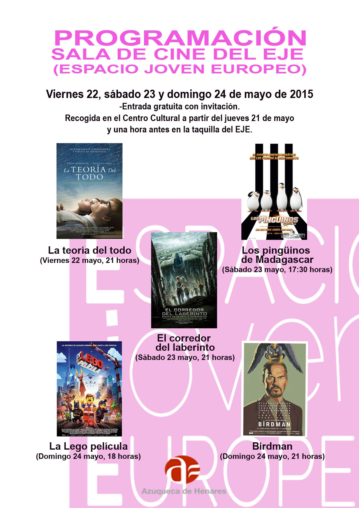 La programación de la sala de cine del Espacio Joven Europeo (EJE) de Azuqueca continúa este fin de semana con cinco películas que se proyectarán entre el viernes, día 22, y el domingo 24 de mayo. En todos los casos, el acceso es gratuito.Esta nueva entrega comienza el viernes, a las 21 horas, con 'La teoría del todo', dirigida por James Marsh e inspirada en la relación entre el célebre científico Stephen Hawking y su primera mujer. Ya el sábado, a las 17:30 horas, se proyectará la cinta de dibujos animados 'Los pingüinos de Madagascar' y por la noche, a las 21 horas, 'El corredor del laberinto', del director Wes Ball.El domingo, día 24, a las 18 horas se proyectará 'La Lego película' y el domingo, a las 21 horas, 'Birdman (o la inesperada virtud de la ignorancia)', dirigida por Alejandro González Iñárritu y ganadora de cuatro premios Óscar (mejor película, director, guión y fotografía).Las invitaciones para acceder a la sala estarán disponibles desde este jueves en la Casa de la Cultura o una hora antes de cada proyección en la taquilla del EJE.Musical infantilPor otra parte, este sábado, a las 19:30 horas, en sala de conciertos del Espacio Joven Europeo, la compañía Sueños de Azúcar presenta el espectáculo musical 'Pinocho se despierta. El sueño de un títere', recomendado a niños de 1 a 8 años. El acceso al espectáculo es libre.