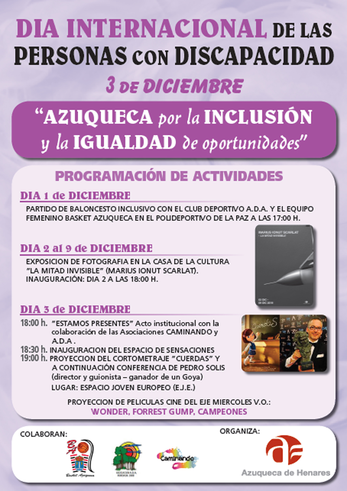 Bajo el lema 'Azuqueca por la inclusión y la igualdad de oportunidades', el Ayuntamiento azudense, con la colaboración de las asociaciones locales ADA y Caminando, va a conmemorar el Día Internacional de las Personas con Discapacidad -3 de diciembre- con un programa de actividades que arranca este sábado, 1 de diciembre, y continuará durante todo el mes."En Azuqueca, defendemos que todas las personas tienen los mismos derechos y deben poder acceder a los mismos servicios, y, desde el Ayuntamiento, trabajamos cada día para que así sea", señala la concejala de Igualdad de Oportunidades, Piedad Agudo, quien destaca la "importante labor" de ADA y Caminando, "colectivos que nos ayudan y orientan para seguir mejorar y alcanzar el objetivo común de la inclusión plena y real".El acto central se celebra el mismo 3 de diciembre, martes, con el acto institucional 'Estamos presentes', que comenzará a las 18 horas en el Espacio Joven Europeo (EJE). A continuación, a las 18:30 horas, se inaugurará el 'Espacio de Sensaciones', proyecto en el que el Ayuntamiento ha invertido 18.000 euros con el objetivo de habilitar una sala con "distintos elementos, proyecciones, música y vibración con los que se pretende crear una experiencia global que fomente la interactividad, la autonomía y la independencia de las personas con discapacidad", recuerda la edil. La jornada finaliza a las 19 horas con la proyección del cortometraje 'Cuerdas', seguida de una conferencia de Pedro Solís, director y guionista de este trabajo, ganador de un Goya. Esta proyección abre el ciclo de diciembre del programa 'Miércoles de cine', que incluye tres proyecciones en versión original con subtítulos, en concreto, 'Wonder', 'Forrest Gump' y 'Campeones'.Deporte y fotografíaEl programa comienza este domingo, con un partido de baloncesto inclusivo entre el CD ADA y el equipo femenino del Club Basket Azuqueca, que comenzará a las 17 horas en el polideportivo La Paz.Además, del 2 al 9 de diciembre, se podrá visitar en la entrada de la Casa de la Cultura la exposición fotográfica 'La mitad invisible', de Marius Ionut Scarlat. La inauguración será el martes 2, a las 18 horas.