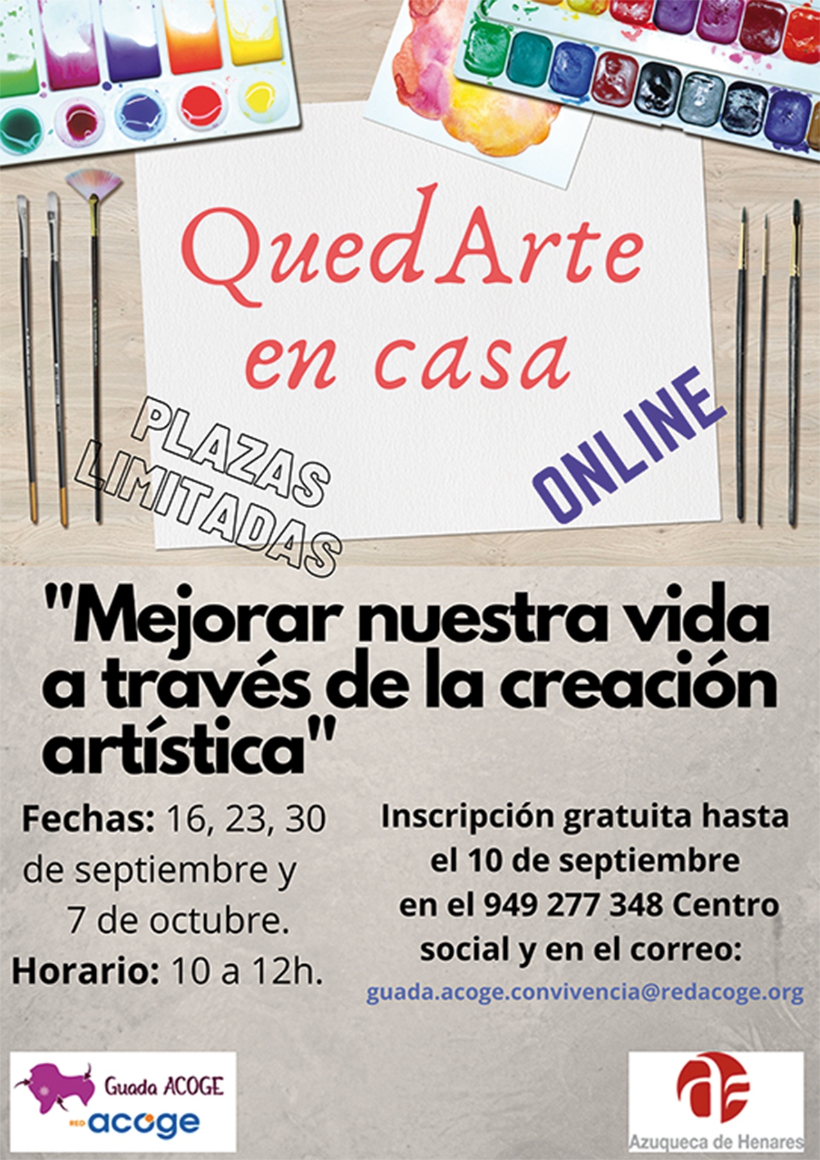 Para ampliar la información y formalizar las inscripciones en ‘QuedArte en casa’, se puede contactar con la organización en el teléfono del Centro Social de Azuqueca de Henares, 949 277 348, o a través del correo electrónico guada.acoge.convivencia@redacoge.org.
