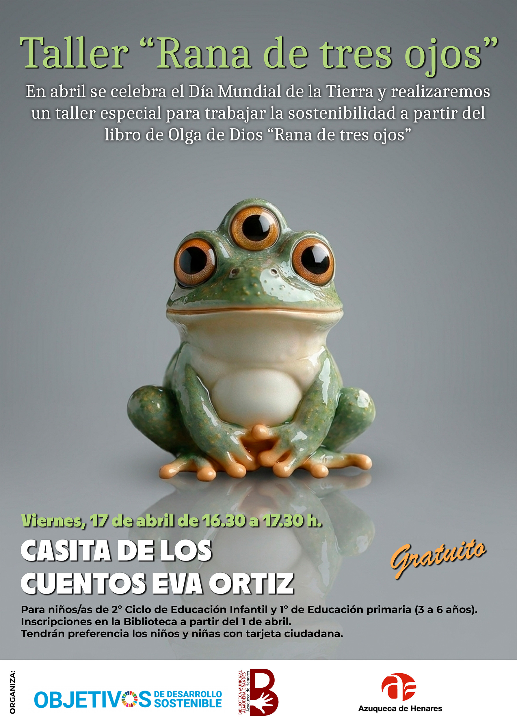 En abril se celebra el Día Mundial de la Tierra 🌍 y realizaremos un taller especial para trabajar la sostenibilidad a partir del libro de Olga de Dios “Rana de tres ojos”.