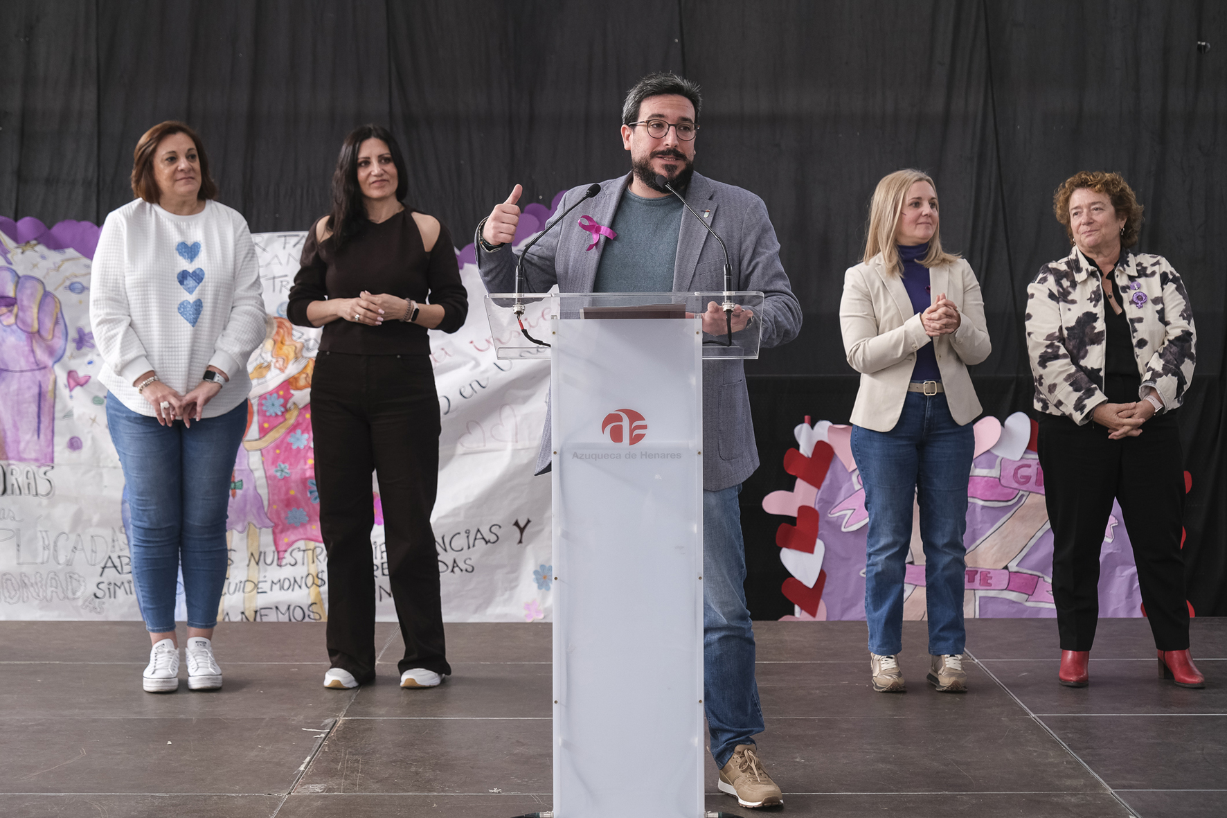 Intervención del alcalde; en segundo plano, desde la izquierda, una concejala del grupo municipal del PP, la primera teniente de alcalde, la concejala de Igualdad y la delegada provincial de Igualdad. Fotografía: Ayuntamiento de Azuqueca