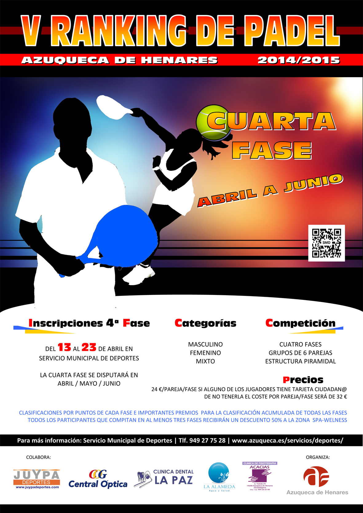 Este lunes, 13 de abril, se abre la inscripción en la cuarta y última fase del Ranking de Pádel, que organiza desde hace cinco temporadas el Ayuntamiento de Azuqueca de Henares. La competición cuenta con tres categorías -Masculino, Femenino y Mixto- y los partidos de esta fase se desarrollarán en los meses de abril, mayo y junio.La cuota de inscripción por pareja es de 24 euros, si alguno de los jugadores es titular de la Tarjeta Ciudadana, y de 32 euros, para el resto. Además, se ofrecen precios reducidos para quienes se inscriban en dos categorías (femenina y mixta o masculina y mixta) y un descuento del 50 por ciento en la zona spa-wellness de la piscina climatizada para los jugadores que compitan en al menos tres de la cuatro fases previstas. Las personas interesadas tienen de plazo hasta el 23 de abril para formalizar su participación, en la oficina del Servicio Municipal de Deportes (SMD), ubicada en la primera planta del pabellón Ciudad de Azuqueca. Más información, pinchando aquí.
