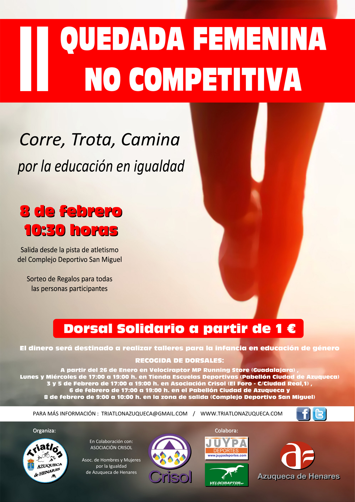 Bajo el lema 'Corre, trota, camina por la educación en igualdad', el Club Triatlón de Azuqueca, con la colaboración del Ayuntamiento y la asociación Crisol, organiza el 8 de febrero la II Quedada Femenina No Competitiva, con salida a las 10:30 horas desde la pista de atletismo del complejo San Miguel. "Se trata de una prueba solidaria con la que se pretende apoyar a los enfermos de hepatitis C, al tiempo que se recaudarán fondos para la realización de talleres de educación de género dirigidos a la población infantil", explica el concejal de Deportes, José Luis Escudero.El recorrido de la Quedada discurre por circuito urbano y se han establecido dos distancias: 6 kilómetros, para quienes se animen a correr o trotar, y 2,8 kilómetros, para los que caminen. Está previsto que al final de la prueba, se sorteen regalos entre todos aquellos que la completen.Las personas interesadas en participar pueden recoger desde este lunes, 26 de enero, el dorsal a partir de un euro. Los puntos habilitados para la retirada de dorsales son los siguientes: - Desde el 26 de enero: Velociraptor MP Running Store (Guadalajara) y los lunes y miércoles, de 17 a 19 h., en la tienda de las Escuelas Deportivas del pabellón Ciudad de Azuqueca (c/ Ana María Matute, s/n).