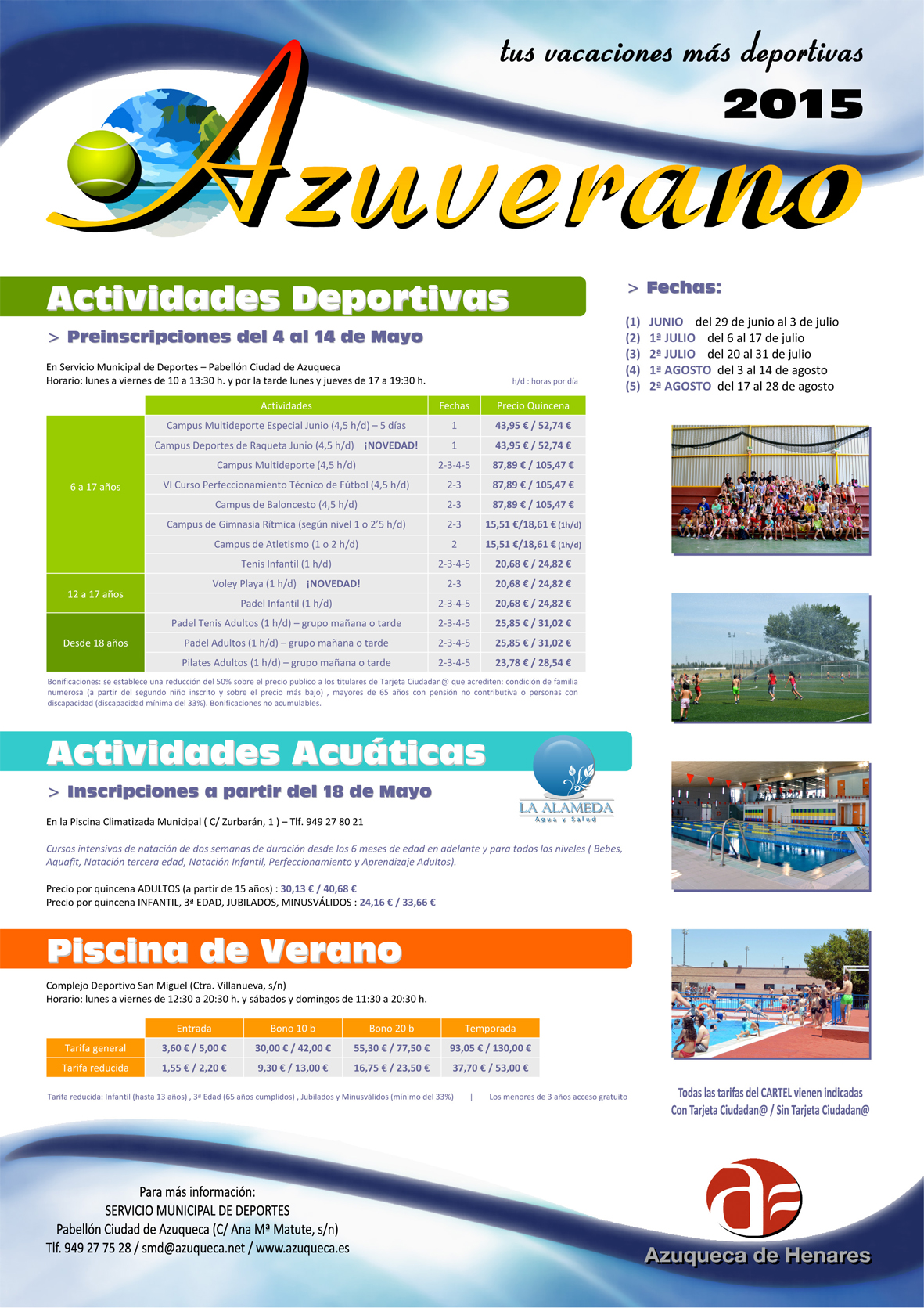 Desde este lunes, 18 de mayo, permanece abierto el plazo de inscripción en las actividades acuáticas del Azuverano, el programa deportivo que desarrolla el Ayuntamiento de Azuqueca de Henares durante los meses de junio, julio y agosto. La oferta acuática se desarrolla en la piscina climatizada e incluye cursos intensivos de natación de dos semanas de duración a partir de los 6 meses de edad y para todos los niveles, en concreto, aquafit, natación para la tercera edad e infantil y perfeccionamiento y aprendizaje de adultos.El precio por quincenas para los adultos (a partir de 15 años) es de 30,13 euros, con Tarjeta Ciudadana, y de 40,68 euros, sin este documento municipal, mientras que para los grupos infantil, tercera edad, jubilados y minusválidos los precios son 24,16 y 33,66 euros, respectivamente.Las personas interesadas pueden informarse sobre horarios y grupos e inscribirse en las instalaciones de la piscina climatizada (c/ Zurbarán, 1) y en el número de teléfono 949 27 80 21.Sorteo de Copa de Fútbol 7Por otra parte, este lunes, a las 19 horas, en el pabellón Ciudad de Azuqueca, se celebra el sorteo de la Copa de Fútbol 7, que se va a disputar del 23 de mayo al 14 de junio. En esta edición, se han inscrito un total de 52 equipos (más información, pinchando aquí). En el acto, se procederá a la entrega de trofeos a los conjuntos campeones de la XVI Liga Municipal de Fútbol 7.Daniel de la Rúa, campeón de EuropaEste domingo, 17 de mayo, Daniel de la Rúa, vecino de Azuqueca de Henares, se proclamó campeón de la Euroliga de baloncesto en categoría Júnior. De la Rúa juega de base en el Real Madrid, que se impuso en la final al Estrella Roja por 73-70. "Estamos muy orgullos de Daniel, que comenzó a formarse en la Escuela Municipal de Baloncesto y en el Basket Azuqueca y que, con esfuerzo y mucho trabajo, ha conseguido llegar a un equipo de primer nivel", destaca el alcalde de Azuqueca, Pablo Bellido. El concejal de Deportes, José Luis Escudero, tambien felicita al base azudense por este título, que se suma a otros logrados este temporada como los Campeonatos de Madrid y de España y el Torneo de L'Hospitalet.