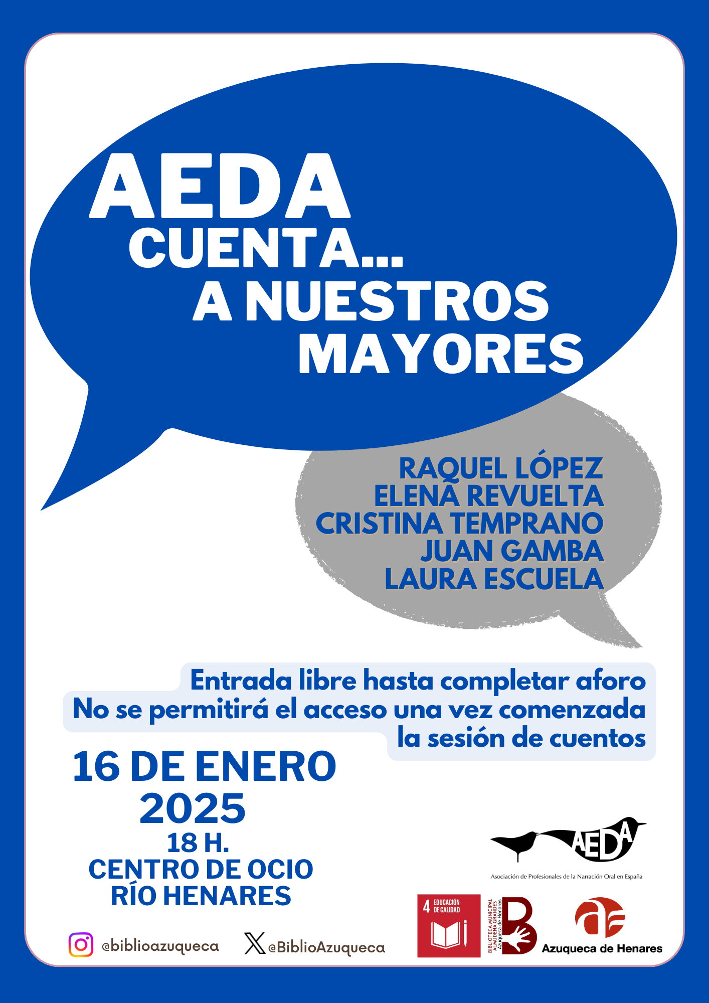 Azuqueca de Henares vuelve a acoger la asamblea anual de la Asociación de Profesionales de la Narración Oral en España (AEDA) que, durante los días 14 y 15 de enero, se celebrará en la Casita de los Cuentos Eva Ortiz.