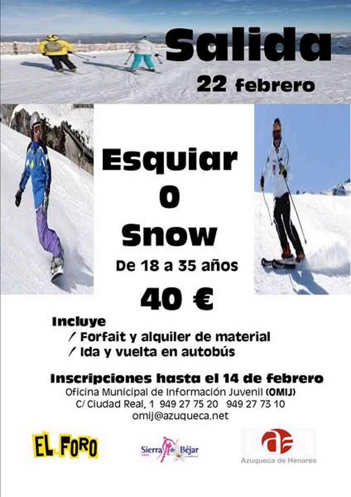 Para el sábado 22 de febrero, el Ayuntamiento de Azuqueca de Henares ha organizado una salida a la estación de La Covatilla, en la sierra de Béjar (Salamanca), dirigida a jóvenes con edades comprendidas entre los 18 y los 35 años ya iniciados en la práctica del esquí o el snowboard. Los interesados pueden inscribirse hasta el viernes, día 14 de febrero, en la oficina Municipal de Información Juvenil, ubicada en el edificio de El Foro.La salida de los participantes se ha previsto a las 7 horas desde el Ayuntamiento, donde se regresará a las 20:30 horas. El precio es de 40 euros y se incluye el transporte en autobús (ida y vuelta), el pase de pista y el alquiler de material.OciotecaPor otra parte, la Ocioteca, el espacio habilitado por la Concejalía de Juventud para el desarrollo de actividades, organiza en el mes de febrero nuevas sesiones abiertas a mayores de 12 años. Las propuestas para los jueves, de 17 a 19 horas, son: práctica con los malabares (día 13) y preparación de máscaras (días 20 y 27). Además, el viernes 28, se celebrará la fiesta ‘Carnaval por la Igualdad’, en la que los asistentes podrán lucir sus propias máscaras.Además, durante este mes la Sala de Juegos de El Foro acogerá dos nuevas grandes partidas para jóvenes de 12 a 17 años, en esta ocasión, de Party (día 14) y de Eye Toy en pantalla gigante (día 28), ambas de 17 a 18:30 horas. La participación es gratuita y la inscripción debe formalizarse en la OMIJ, de 16:30 a 17 horas.